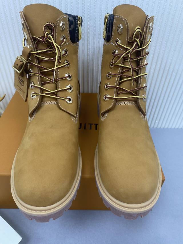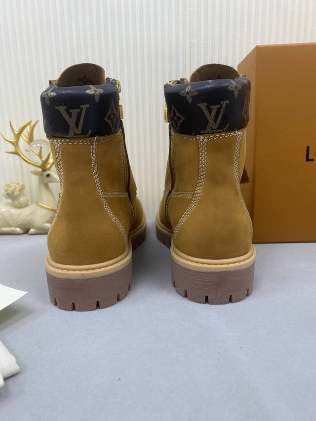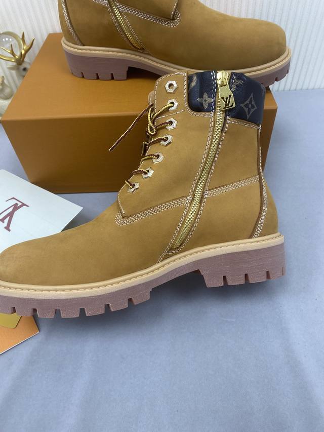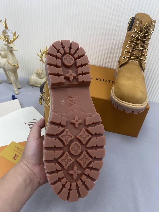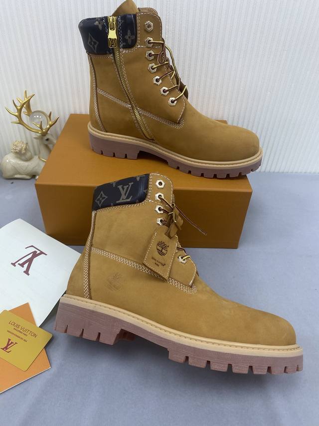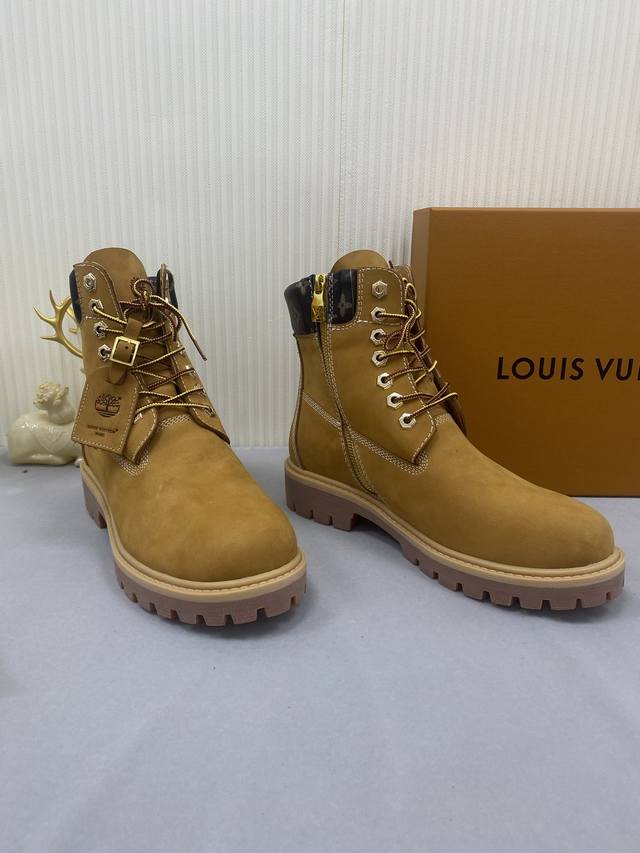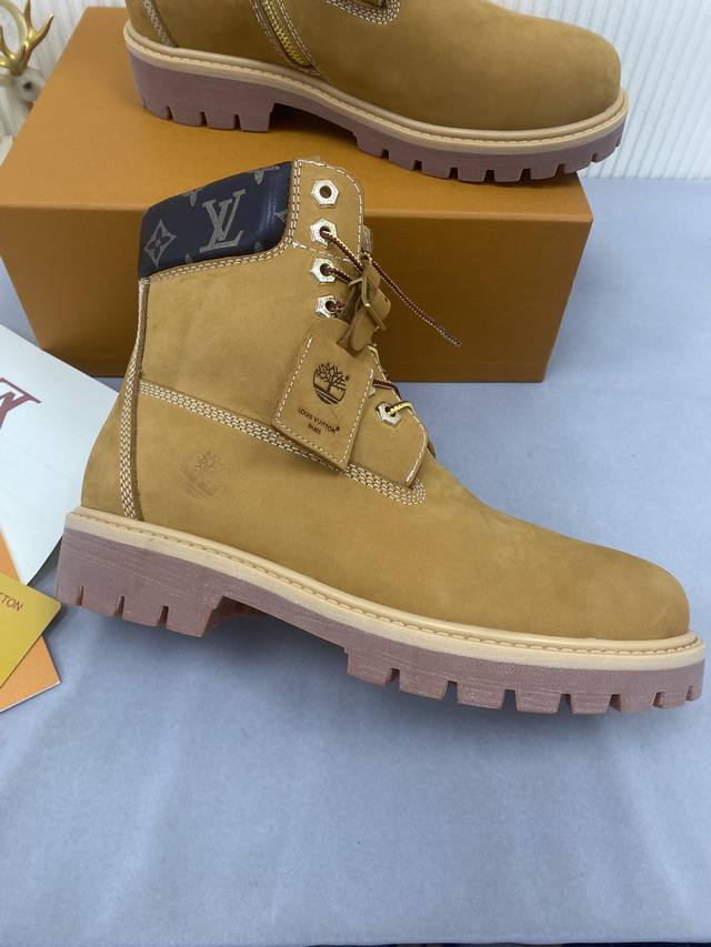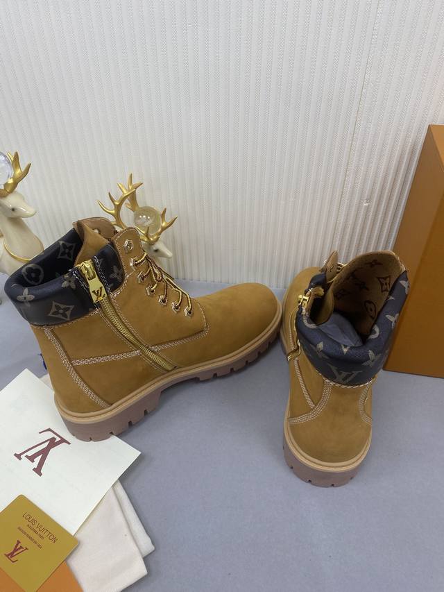 顶级版本:情侣款Lv X Timberland 添柏岚 联名款 老花 压花 大黄靴 及踝靴 短靴 Lv X Timberland 及踝靴取材 Monogram 压纹防水正绒面牛皮革,依托品牌精湛匠艺于意大利悉心重塑经典 Timberland 6 英寸靴型,以美式工装格调瞩目亮相 Pharrell Williams 打造的 秋冬男装秀。Monogram 压纹鞋舌、Timberland 原版鞋带和外底点睛考究细节,皮革标签抒写合作标识 配送专柜精美包装 面料: 原版定制进口头层牛皮 内里: 原版定制皮里 网里