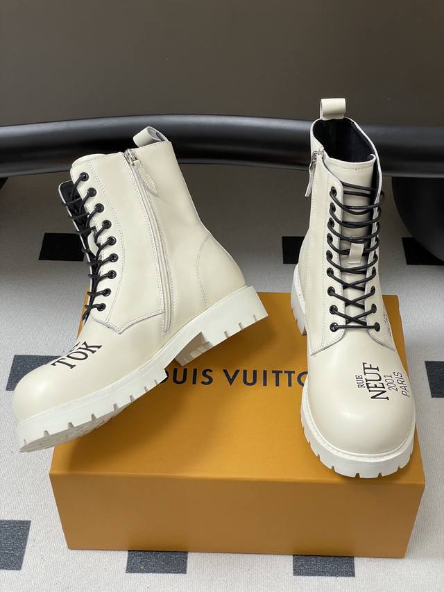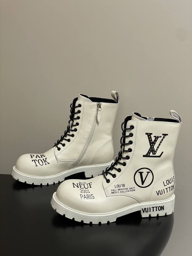 25Fw秋冬新款Louis Vuitton Lv 涂鸦马丁靴系列情侣装侧拉链短靴系带厚底马丁靴 本款涂鸦铆钉马丁靴承载军旅灵感和路易威登的旅行传承,为舒软牛皮革