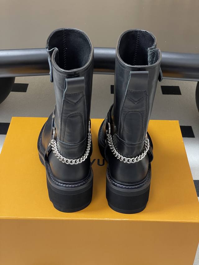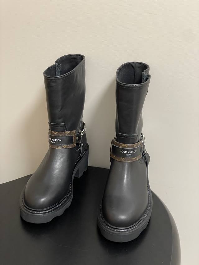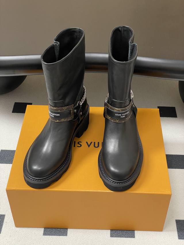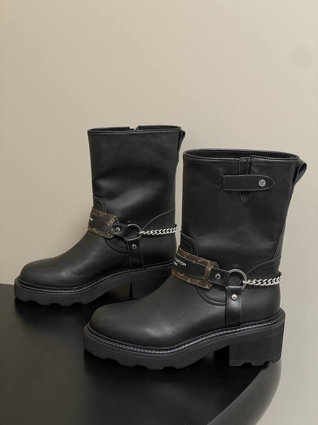 25Fw秋冬新款Louis Vuitton Lv 链条短筒靴一脚蹬老花皮拼色厚底高跟切尔西短靴 本款 Lv Beaubourg切尔西及踝靴拼接光滑牛皮革和Mon