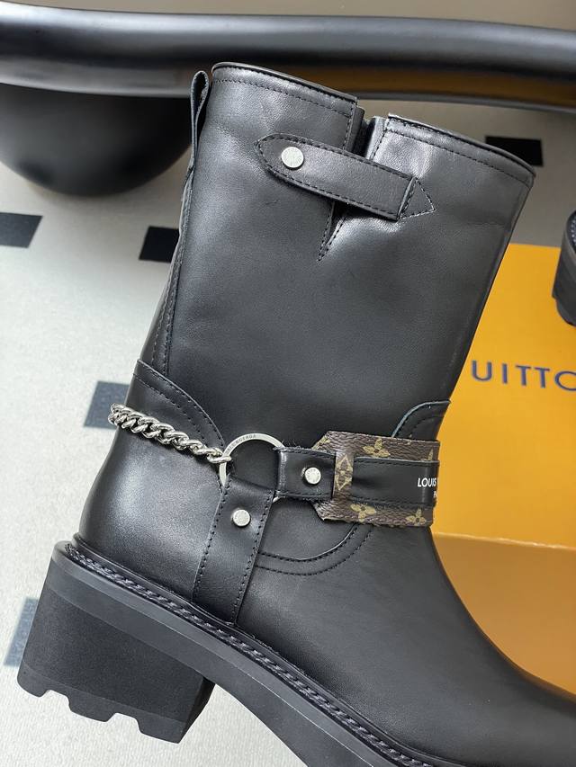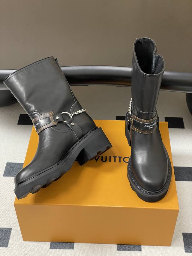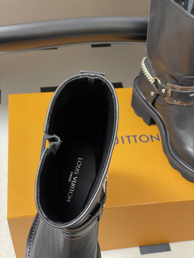 / 25Fw秋冬新款Louis Vuitton Lv 链条短筒靴一脚蹬老花皮拼色厚底高跟切尔西短靴 本款 Lv Beaubourg切尔西及踝靴拼接光滑牛皮革和Mon