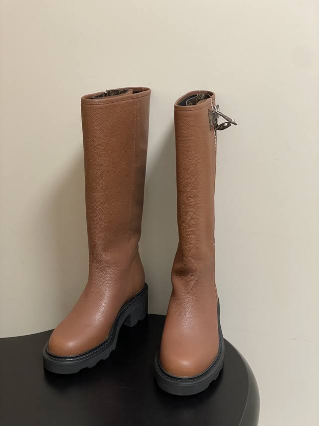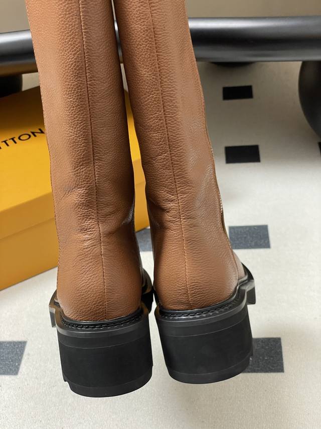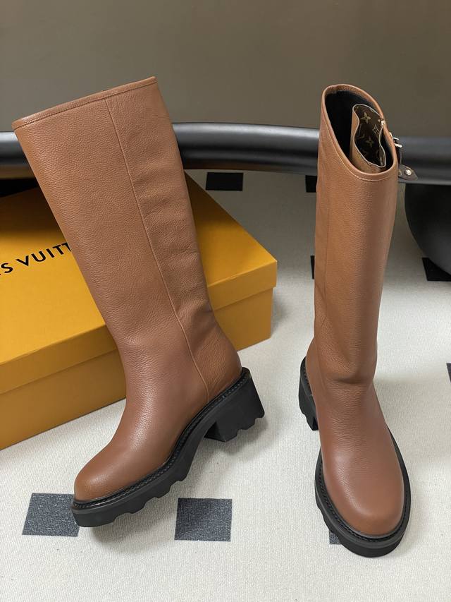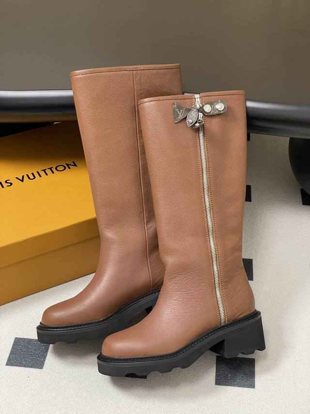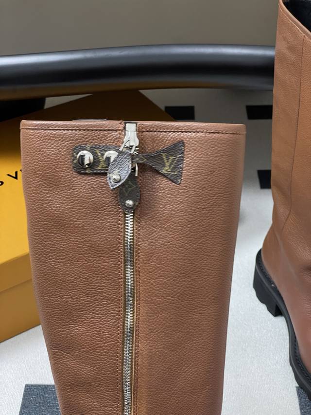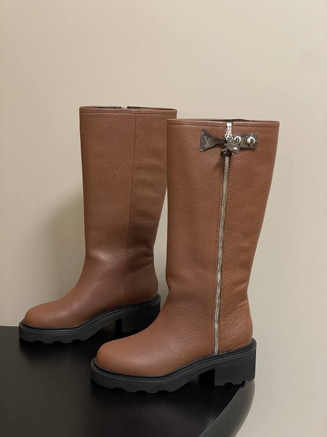 25Fw秋冬新款Louis Vuitton Lv Beaubourg高筒靴老花吊坠骑士靴厚底侧拉链长靴 本款 Lv Beaubourg高筒靴取材柔软粒面羊皮革,