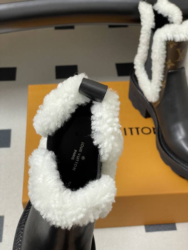 25Fw秋冬新款Louis Vuitton Lv Beaubourg 羊毛口切尔西及踝靴松紧带棋盘格老花皮拼色厚底高跟切尔西短靴 本款 Lv Beaubourg羊毛口切尔西及踝靴拼接光滑牛皮革和Monogram帆布,以率性风姿回归潮流视野。凸纹微型外底厚实而不失轻盈质感,环绕沿条的撞色缝线为经典设计注入考究气息。 鞋面:牛皮 老花皮 内里垫脚:羊皮 鞋底:开模组合橡胶大底 码数:35-39 40.41定做不退换