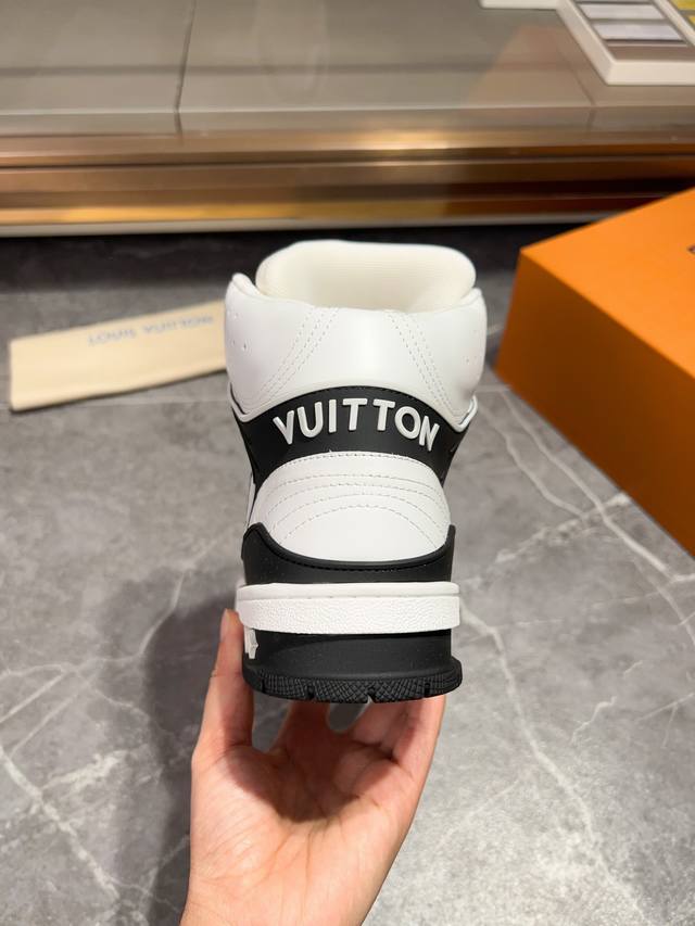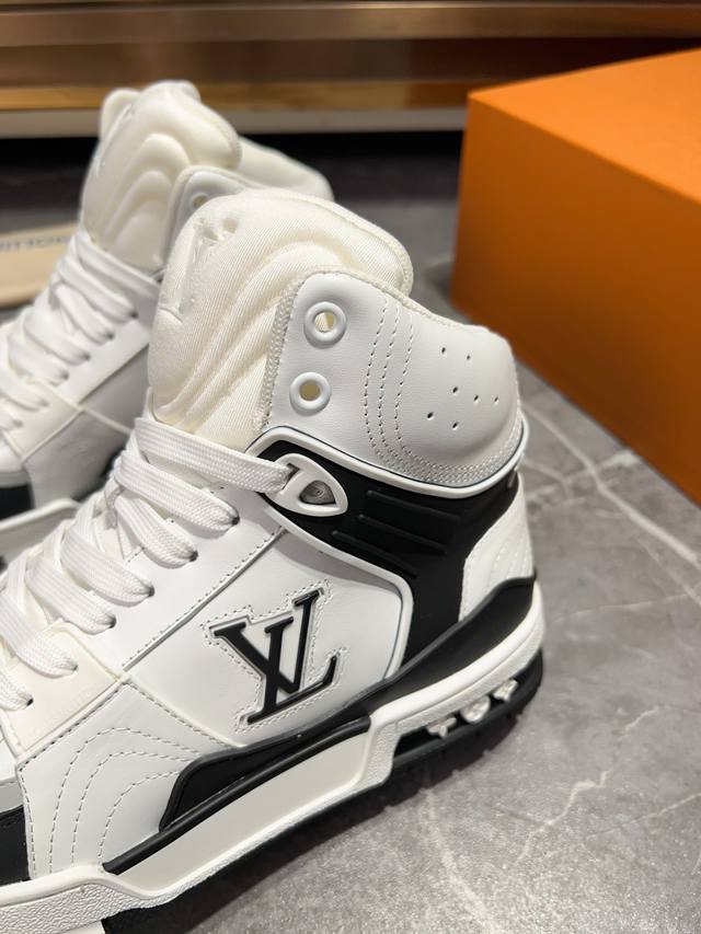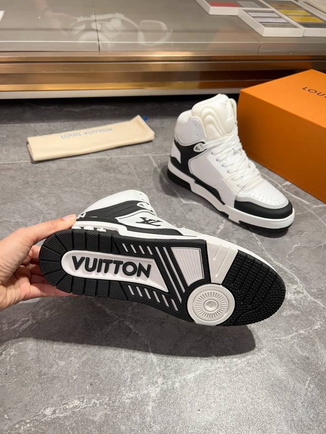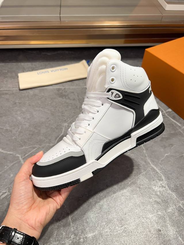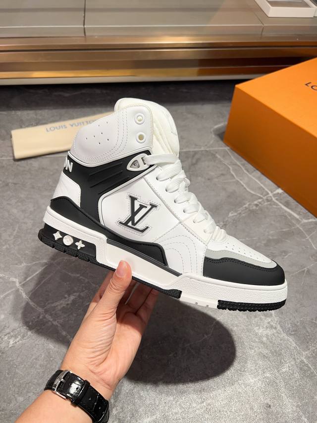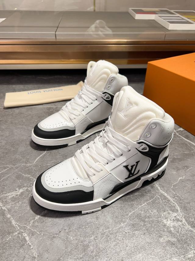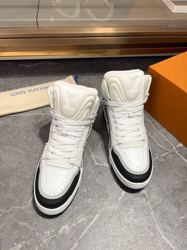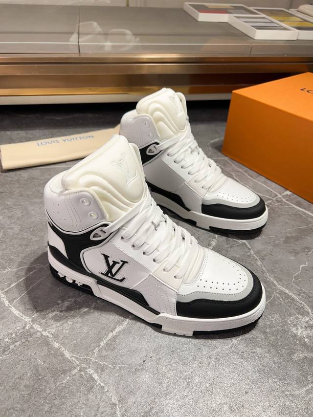 / L 秋冬男士高帮经典休闲运动鞋,本款运动鞋为柔软牛皮革压印经典 Damier 图案,再以侧面的大号 Lv 字母跃动活力。橡胶外底完善整体设计,记忆性人体工学鞋垫