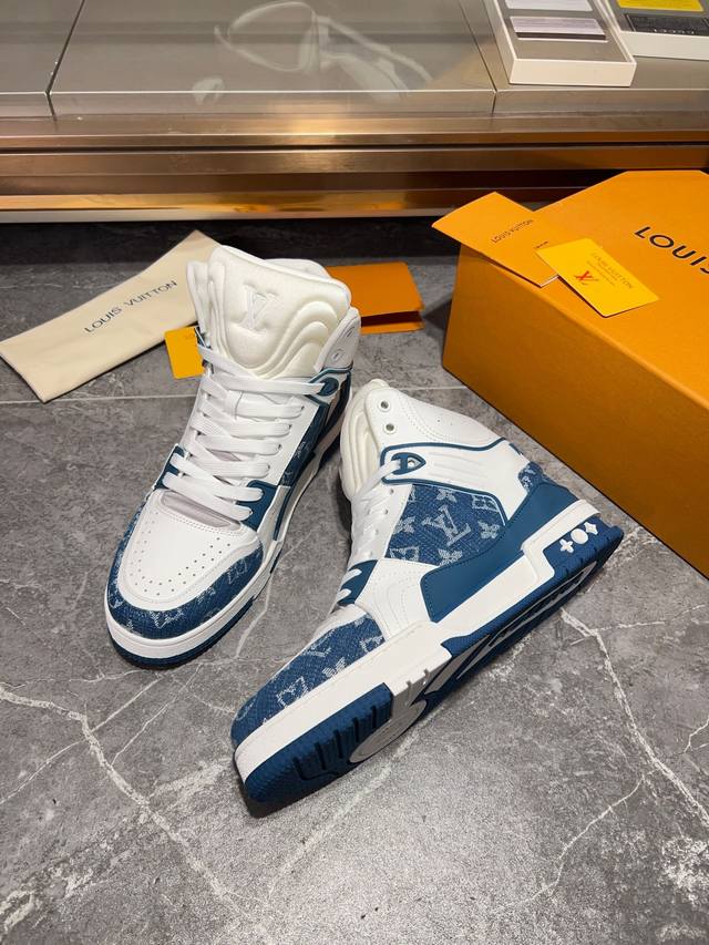 / L 秋冬男士高帮经典休闲运动鞋,本款运动鞋为柔软牛皮革压印经典 Damier 图案,再以侧面的大号 Lv 字母跃动活力。橡胶外底完善整体设计,记忆性人体工学鞋垫
