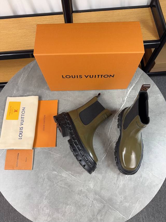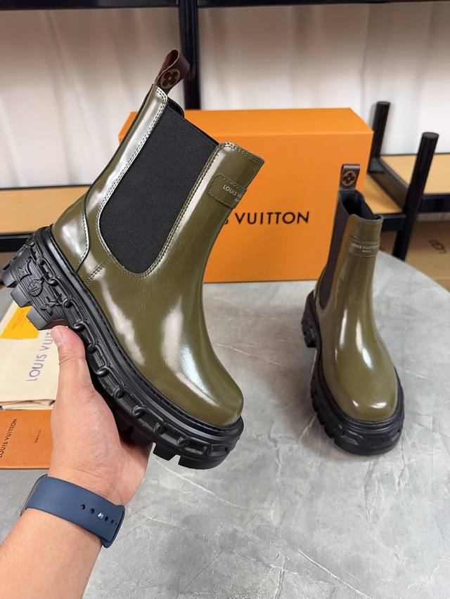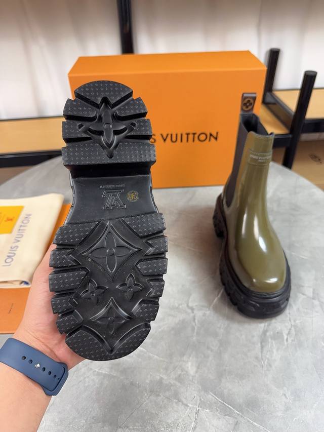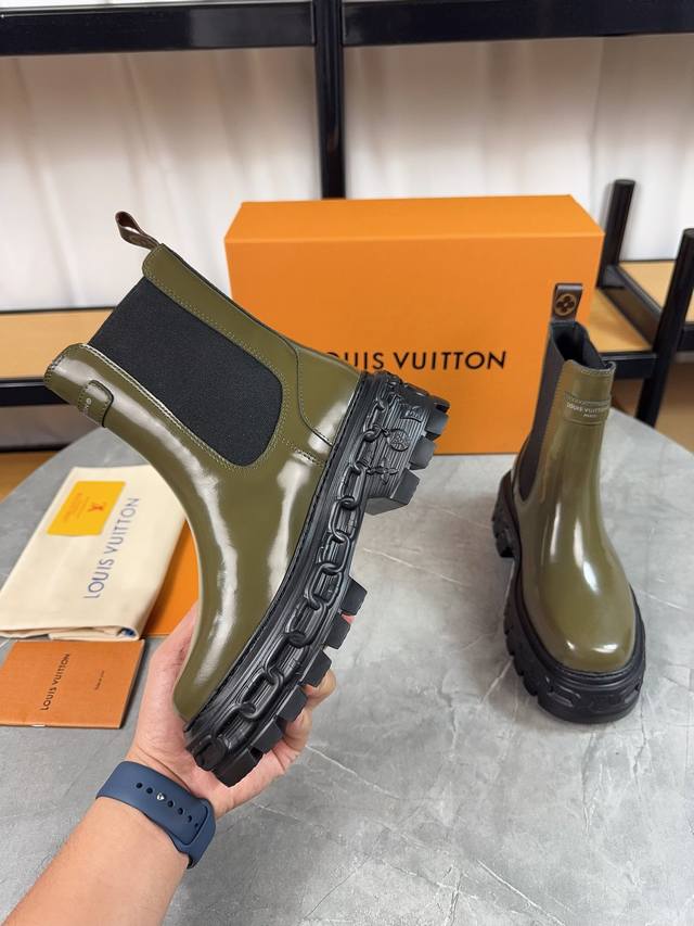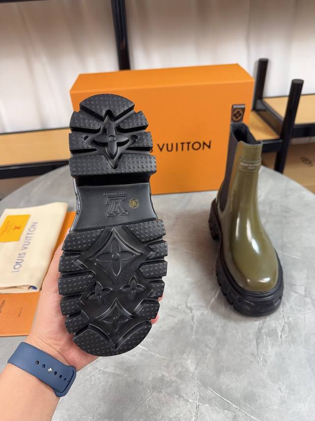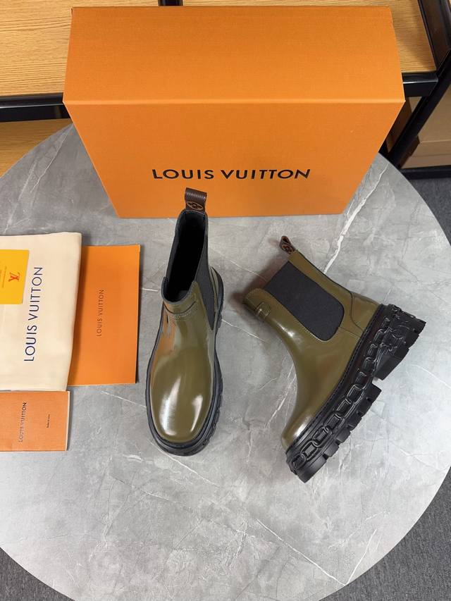 / Louis Vuitton 新款短靴;优美线条拒绝臃肿,原版头层牛皮拼高丝光磨砂牛皮,细带机车靴方便穿脱,没有对比就没 隔绝冬季寒冷 鞋面:原版开边珠牛皮 内里