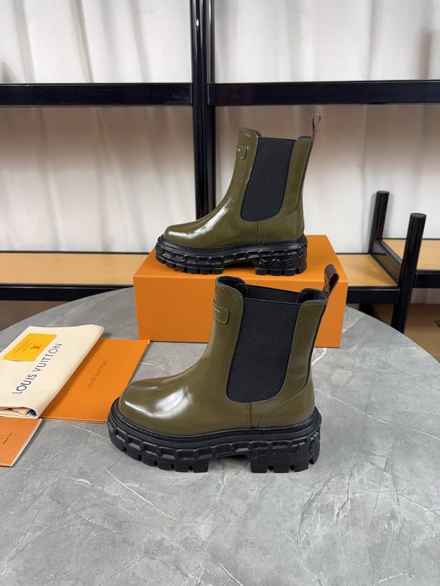 Louis Vuitton 新款短靴;优美线条拒绝臃肿,原版头层牛皮拼高丝光磨砂牛皮,细带机车靴方便穿脱,没有对比就没 隔绝冬季寒冷 鞋面:原版开边珠牛皮 内里:牛皮 垫脚:牛皮皮 大底:原版耐磨防滑生胶底 底高:6Cn 包装:原版Lv专用盒 码数:34-41 34 41定制不退换 靴筒高度6寸 颜色: 黑色 军绿