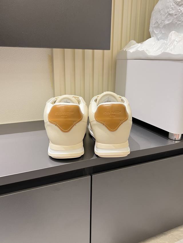 l V 驴家新款运动鞋,这款运动鞋以双色牛皮革升级品牌经典运动鞋,借利落线条续写跑鞋灵感。楔形外底、侧面饰有 Lv...