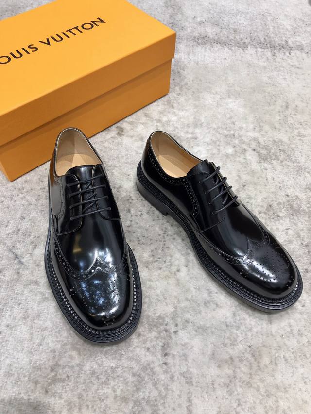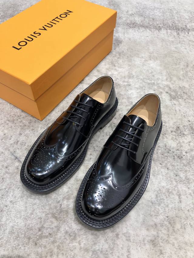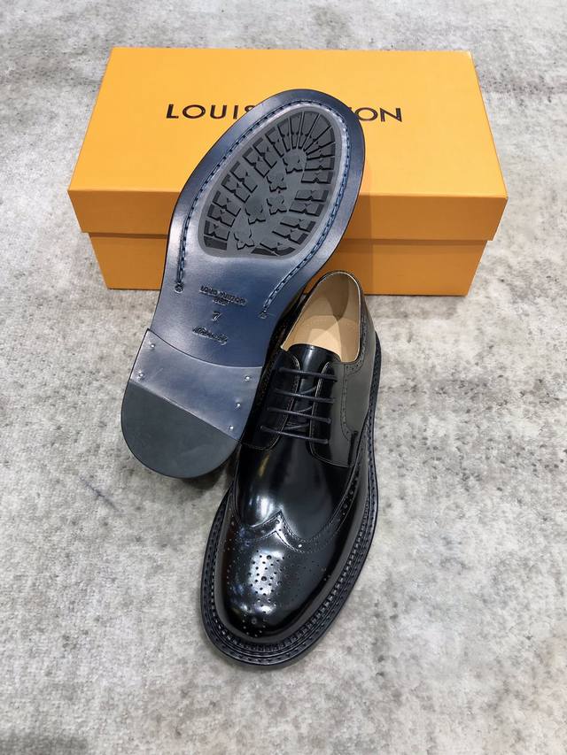 Louis Vuitton Lv 路易威登 小牛皮皮革牛津鞋 精致布洛克雕花相互辉映纹压 意大利古法手工描改擦色 易于搭配各式正装压阵系列 采用进口皮革 开边珠 鞋面固特异纯手工工艺制作 精致细节车工缝线 手工缝制勾兑大底 内里都是选的意大利进口饮奶小牛皮 细腻柔软 垫脚是标配的饮奶小牛皮Louis Vuitton银Logo 本色意大利真皮大底 高清深度压纹Louis Vuitton徽章 多层次真皮层后跟手工打磨成型 后跟固定防滑钉 后跟前掌复合以橡胶底片减震 防滑 大底都是艺术感十足 重工打造精品 匠心
