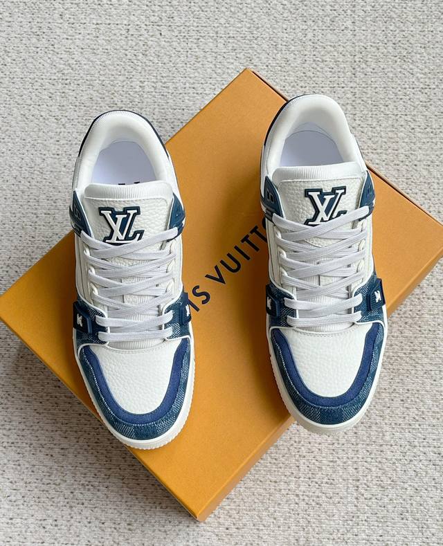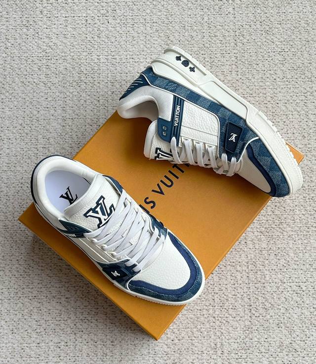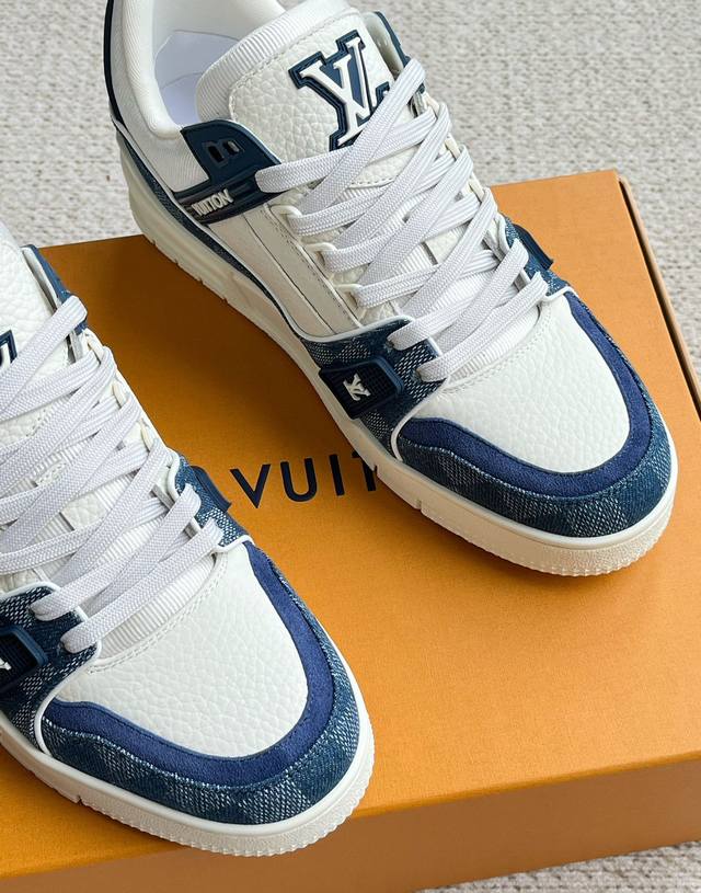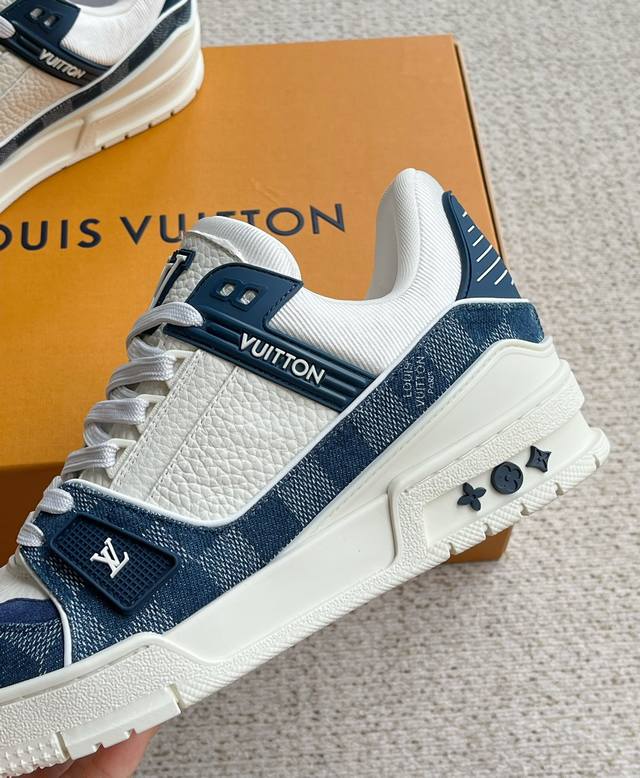 Lv新款男士休闲鞋 官网同步 本款 Lv Trainer 运动鞋以 Damier 丹宁布和光滑牛皮革构筑繁复鞋面,需要数小时的匠心缝制方可完成。橡胶标识和科技橡