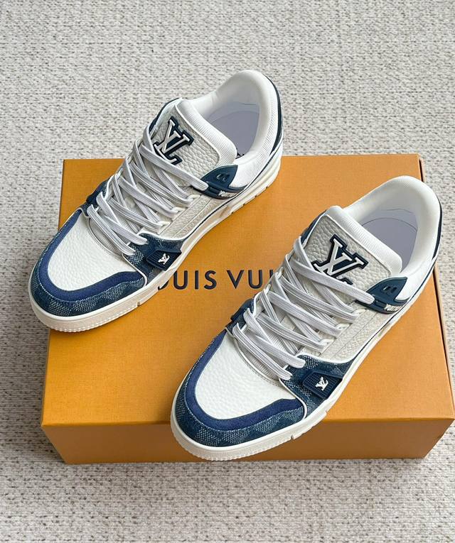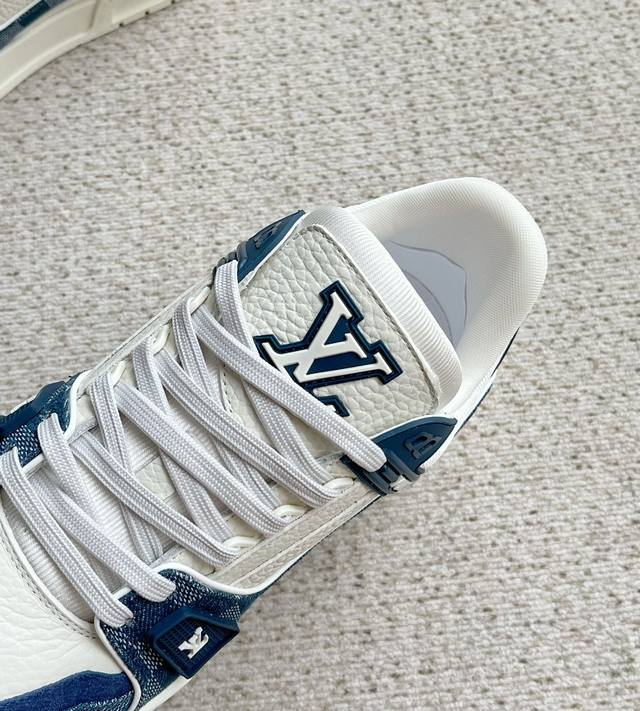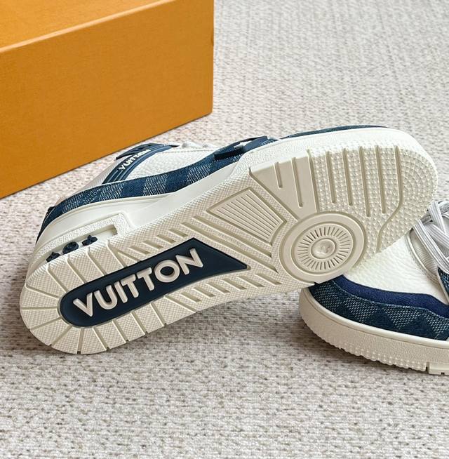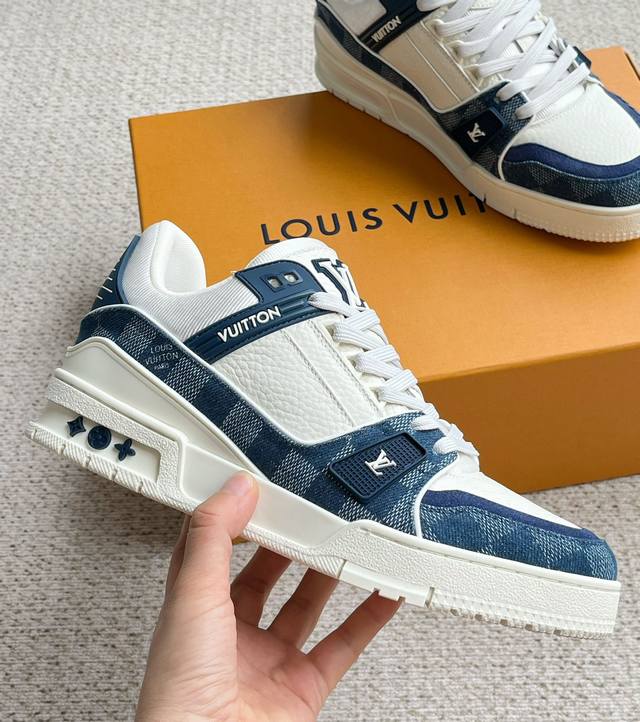 / Lv新款男士休闲鞋 官网同步 本款 Lv Trainer 运动鞋以 Damier 丹宁布和光滑牛皮革构筑繁复鞋面,需要数小时的匠心缝制方可完成。橡胶标识和科技橡