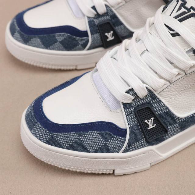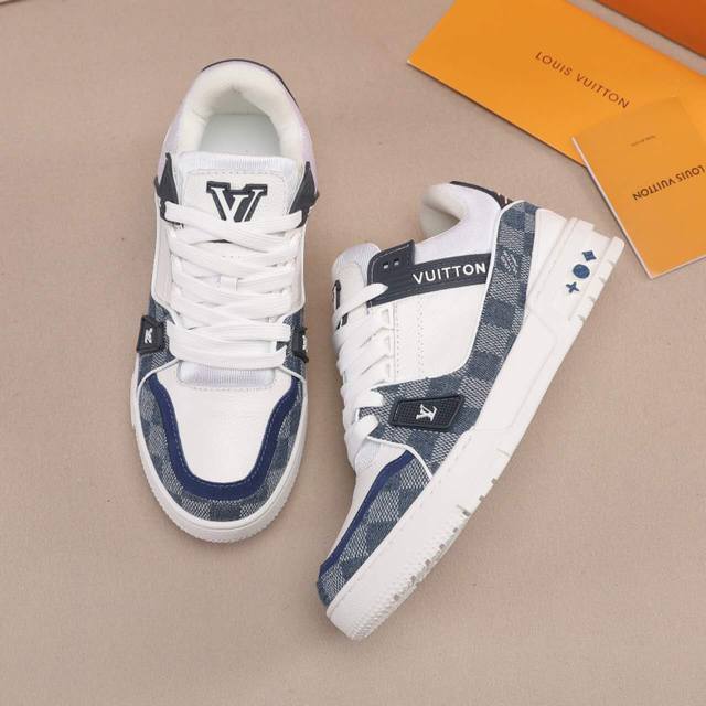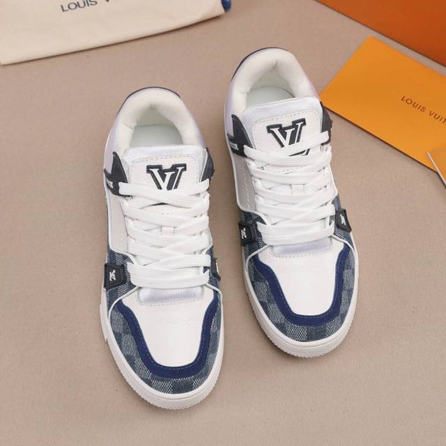 Lv Trainer系列 独家实拍专柜同步上线原版本 1:1原鞋鞋开发,上脚非常舒适 做工精细 鞋面由意大利头层小牛皮拼接制成,侧边饰有品牌logo标志及签名,