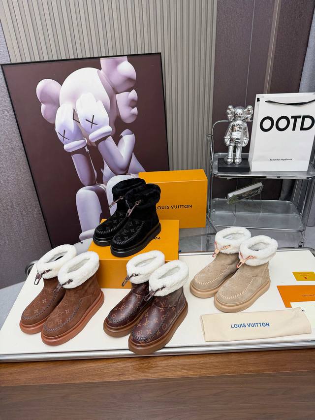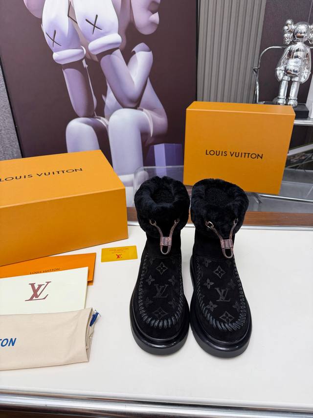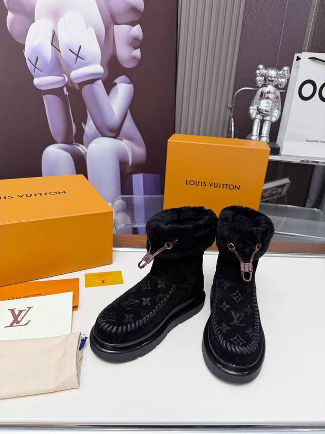 Size:35-42 42订做不退换 Ddd Louis Vuitton秋冬最新毛靴 Ddd 2025Lv走秀款 Ddd 鞋面:进口高丝光牛皮 Ddd 内里:毛 里超级暖和 Ddd 原版开模发泡组合大底,全套精美包装 DDD