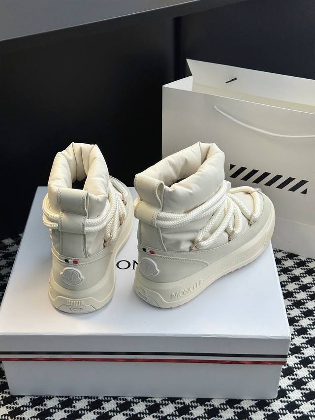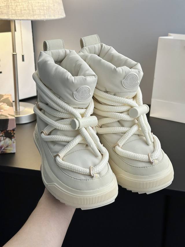 系列雪地靴 灵感源自 Moncler 典藏雪地靴,将大胆设计与实用功能完美融合,重新定义都市冬日生活方式 行走的羽绒服:-10℃也能暴走雪地 工业风美学:粗绳鞋带+黑白撞色,机能感拉满 低调奢华:后跟Logo压印,懂的人自然懂 适用场景:冬季户外滑雪、雪地徒步,城市日常搭配大衣、羽绒服等冬季服饰,轻松打造时尚造型 防滑耐磨 鞋面材质:防水尼龙+填充30%羽绒70% 鞋里材质:空气棉内里 鞋底材质:原版Vibram橡胶+Tpu大底 鞋码选购:女款35-40 40.41定制