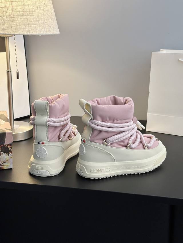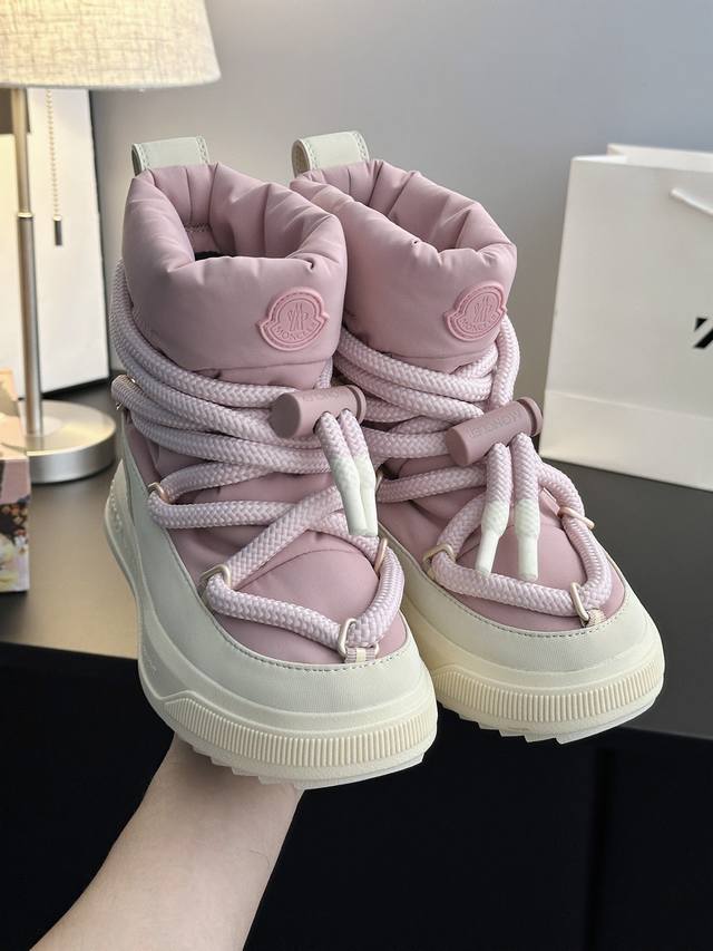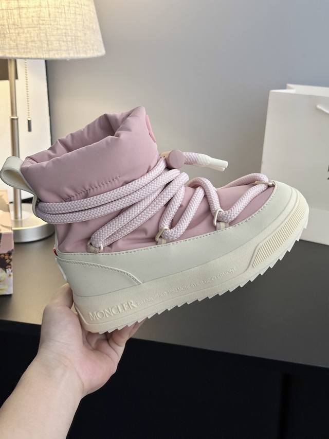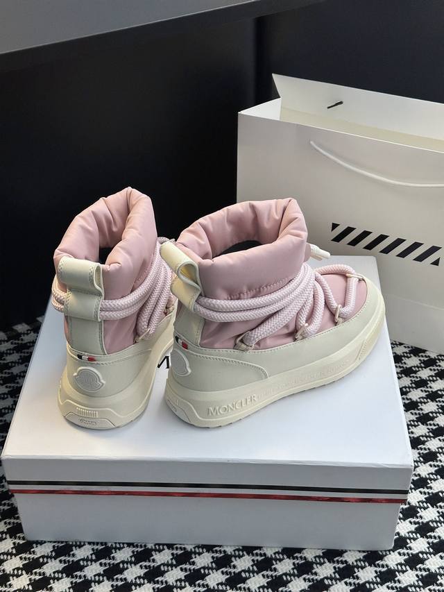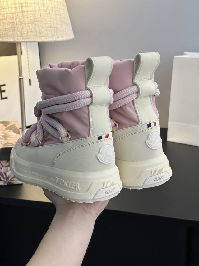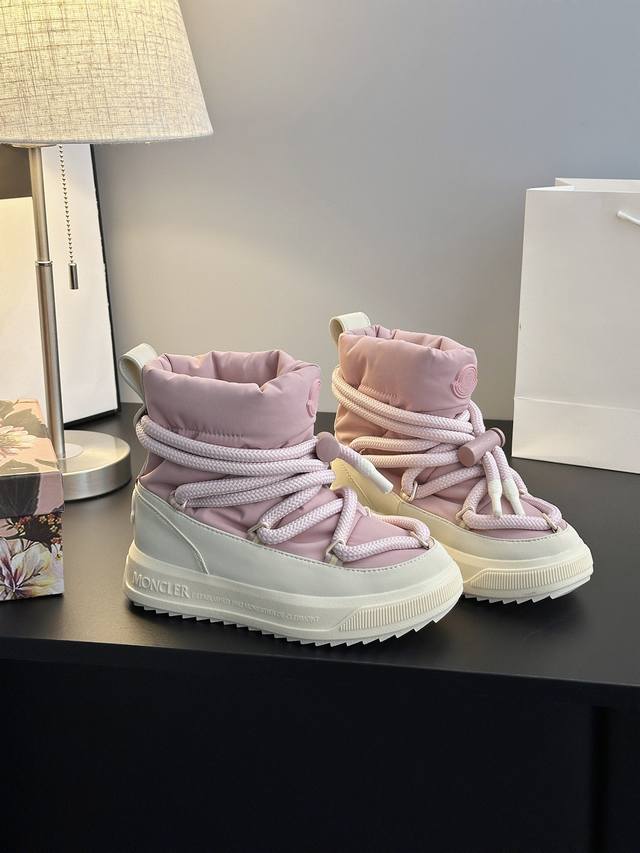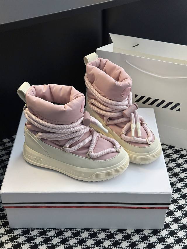 系列雪地靴 灵感源自 Moncler 典藏雪地靴,将大胆设计与实用功能完美融合,重新定义都市冬日生活方式 行走的羽绒服:-10℃也能暴走雪地 工业风美学:粗绳鞋带+黑白撞色,机能感拉满 低调奢华:后跟Logo压印,懂的人自然懂 适用场景:冬季户外滑雪、雪地徒步,城市日常搭配大衣、羽绒服等冬季服饰,轻松打造时尚造型 防滑耐磨 鞋面材质:防水尼龙+填充30%羽绒70% 鞋里材质:空气棉内里 鞋底材质:原版Vibram橡胶+Tpu大底 鞋码选购:女款35-40 40.41定制