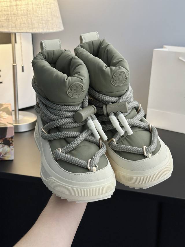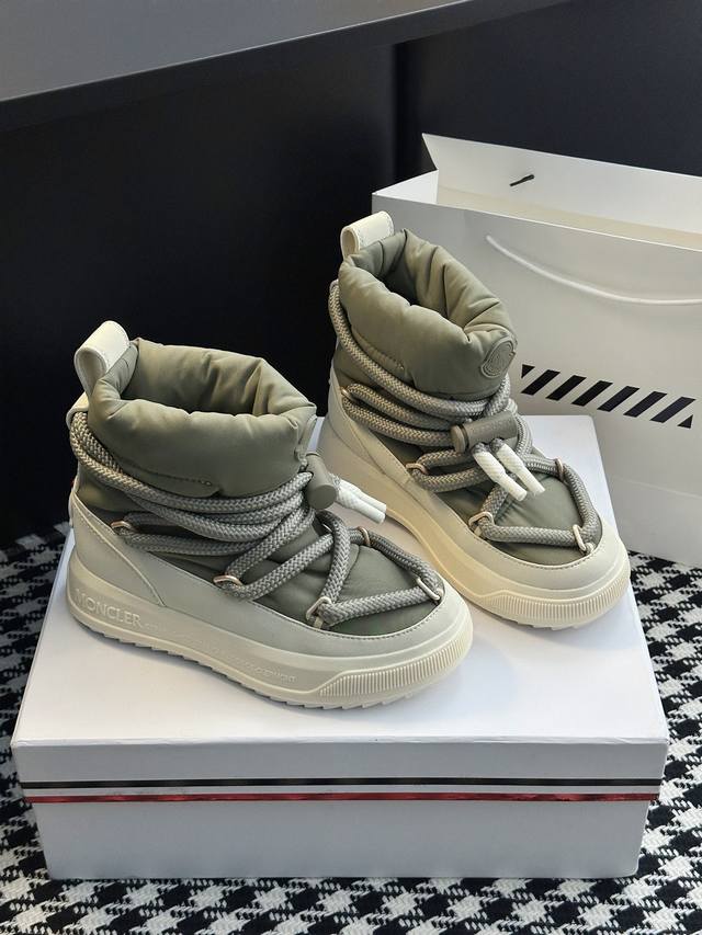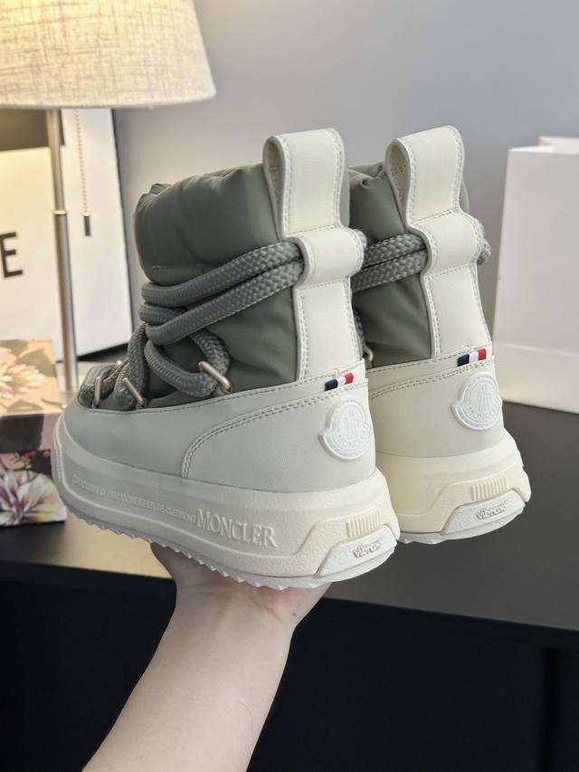 系列雪地靴 灵感源自 Moncler 典藏雪地靴,将大胆设计与实用功能完美融合,重新定义都市冬日生活方式 行走的羽绒服:-10℃也能暴走雪地 工业风美学:粗绳鞋带+黑白撞色,机能感拉满 低调奢华:后跟Logo压印,懂的人自然懂 适用场景:冬季户外滑雪、雪地徒步,城市日常搭配大衣、羽绒服等冬季服饰,轻松打造时尚造型 防滑耐磨 鞋面材质:防水尼龙+填充30%羽绒70% 鞋里材质:空气棉内里 鞋底材质:原版Vibram橡胶+Tpu大底 鞋码选购:女款35-40 40.41定制