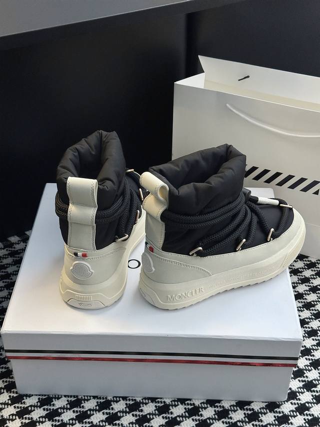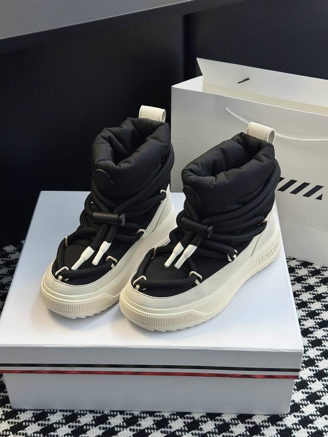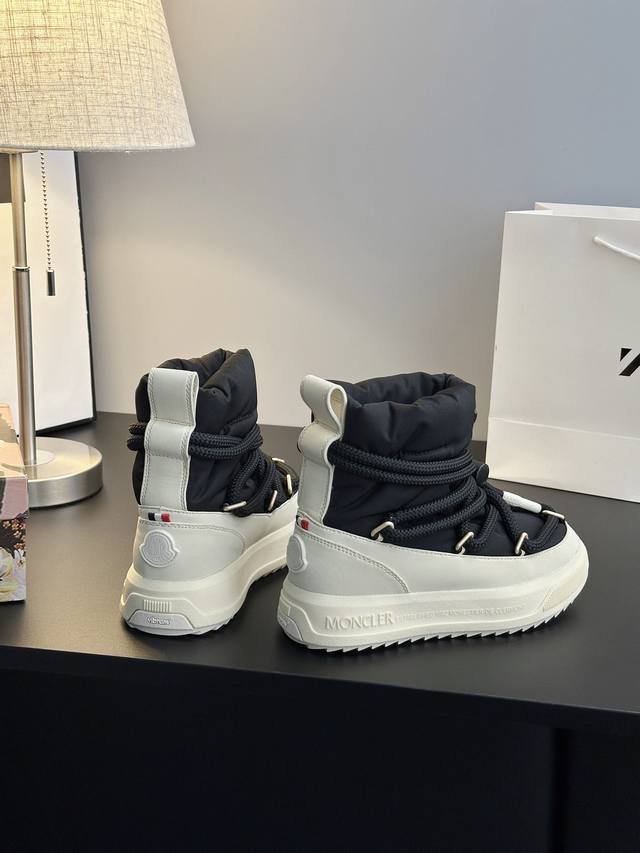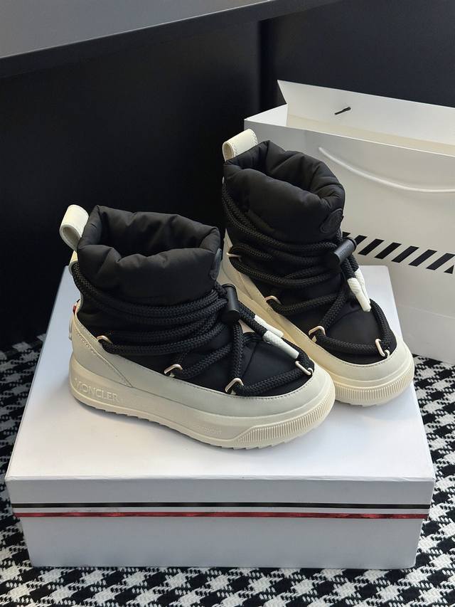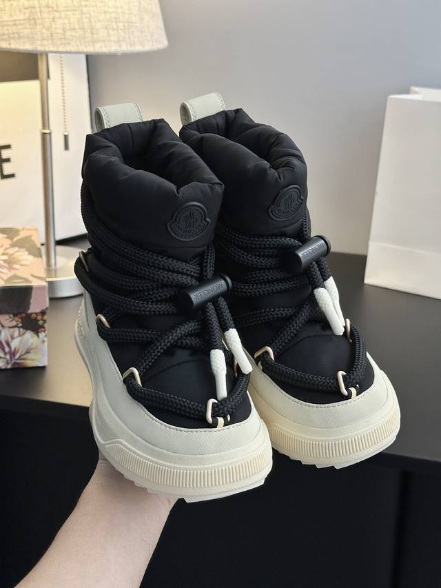 系列雪地靴 灵感源自 Moncler 典藏雪地靴,将大胆设计与实用功能完美融合,重新定义都市冬日生活方式 行走的羽绒服:-10℃也能暴走雪地 工业风美学:粗绳鞋带+黑白撞色,机能感拉满 低调奢华:后跟Logo压印,懂的人自然懂 适用场景:冬季户外滑雪、雪地徒步,城市日常搭配大衣、羽绒服等冬季服饰,轻松打造时尚造型 防滑耐磨 鞋面材质:防水尼龙+填充30%羽绒70% 鞋里材质:空气棉内里 鞋底材质:原版Vibram橡胶+Tpu大底 鞋码选购:女款35-40 40.41定制