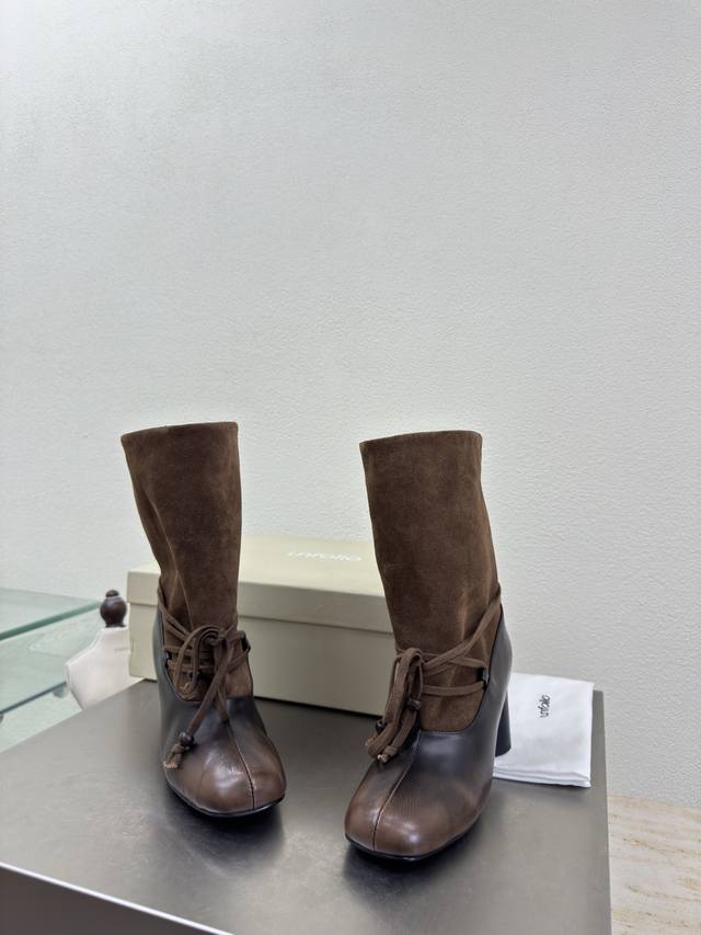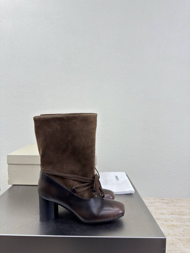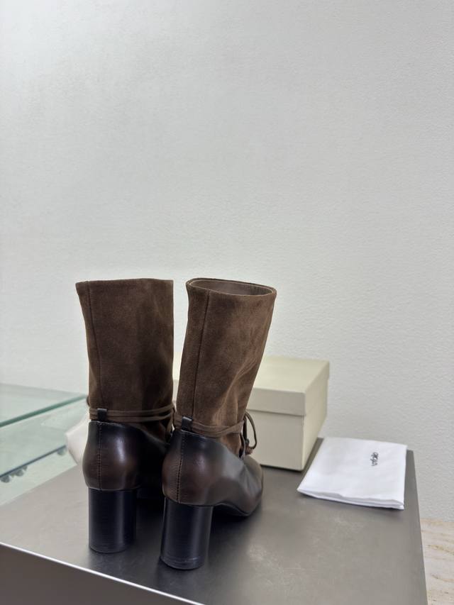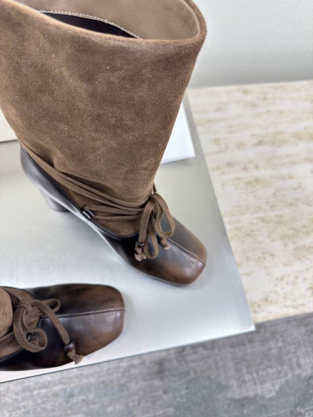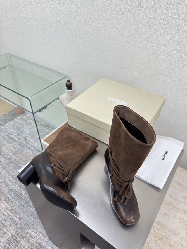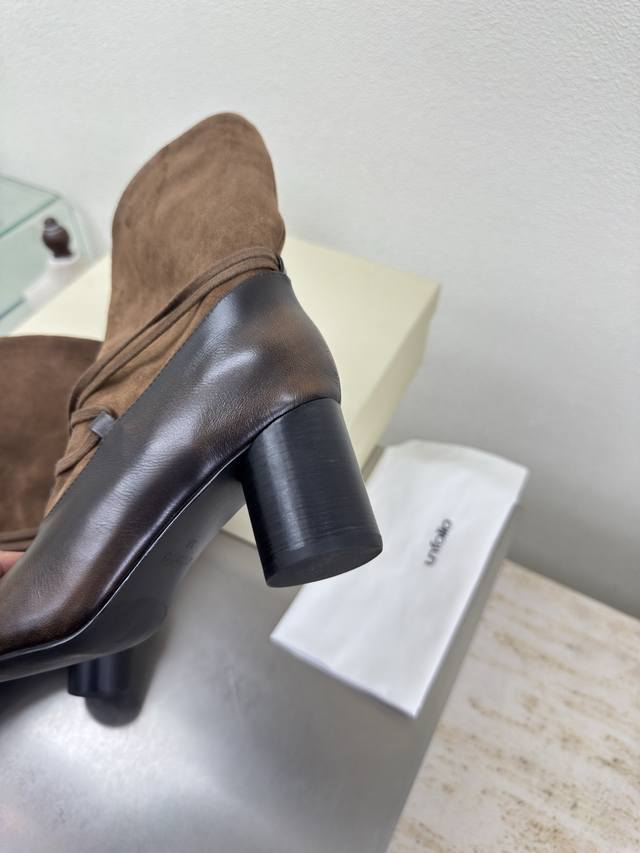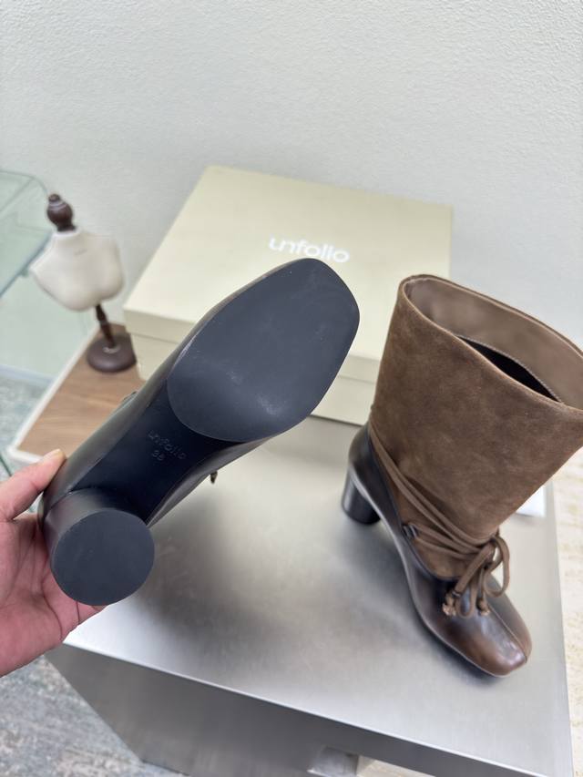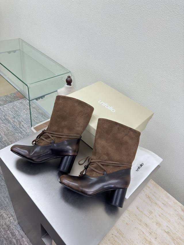 一脚蹬 中跟 易搭配 Unfolio精品 短靴 小众设计师25发布会新款 牛反绒皮拼擦色牛皮 面料选用 小牛皮设计 内里舒适羊皮里 原版可回收材质收腰流线型橡胶