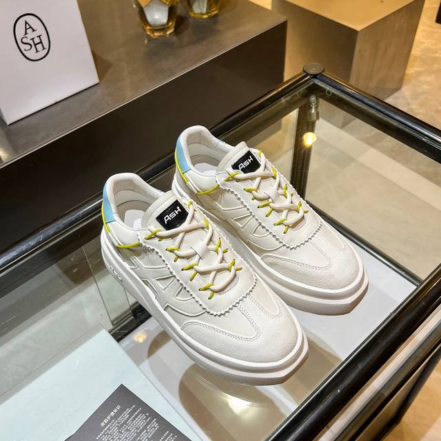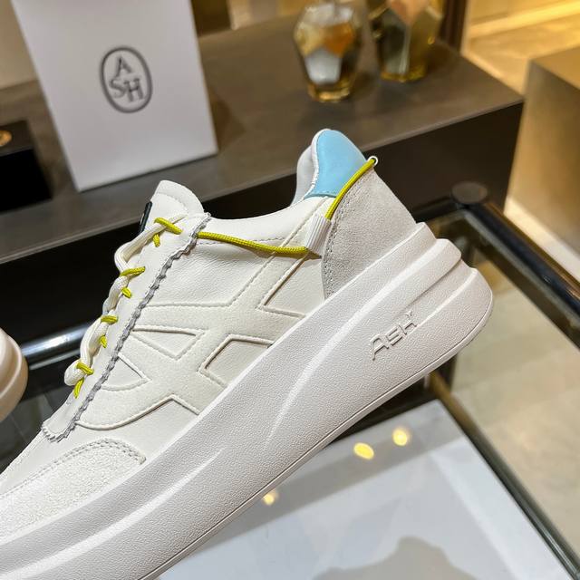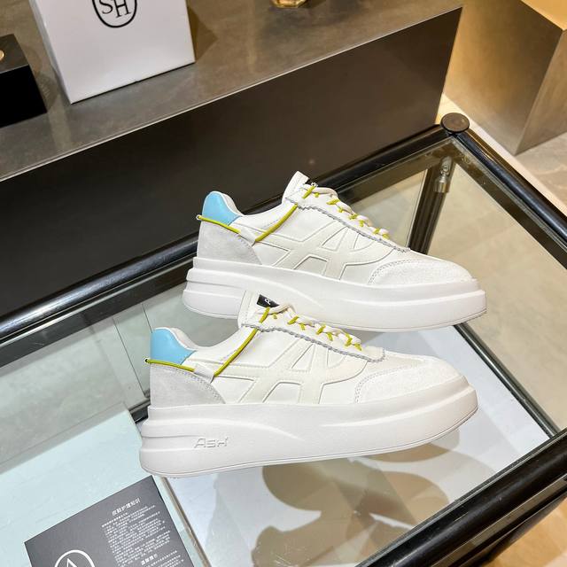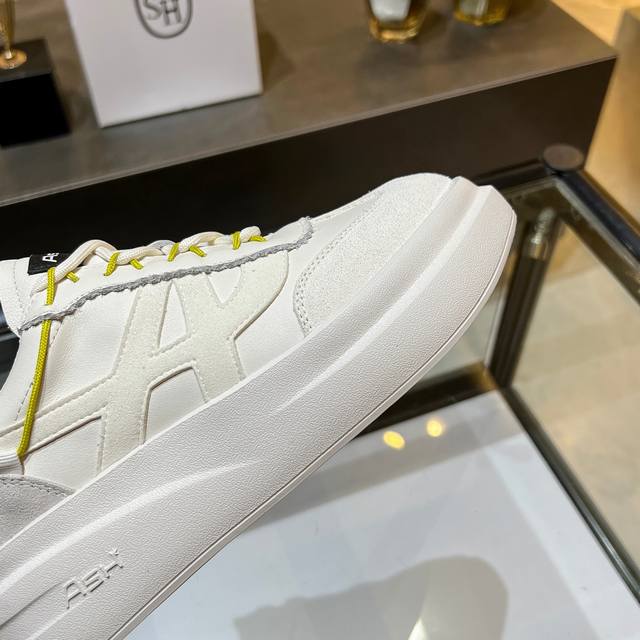 上新Ash 款号023 秋季明星同款 休闲系列,简约设计的冲孔透气鞋身,搭配轻盈回弹增高鞋底。 鞋底:橡胶发泡大底面料: 头层牛皮+牛反绒内里:羊皮 颜色:黑色
