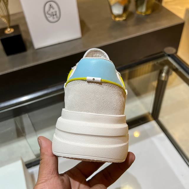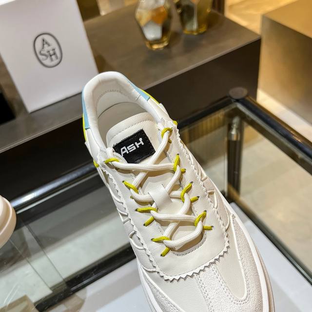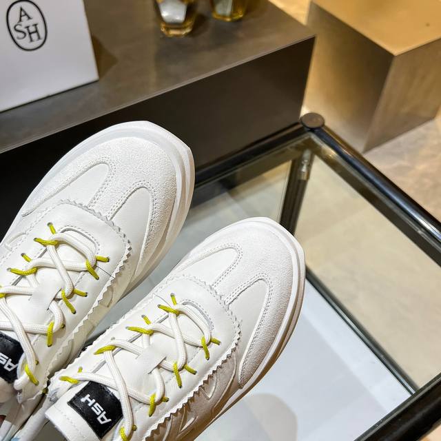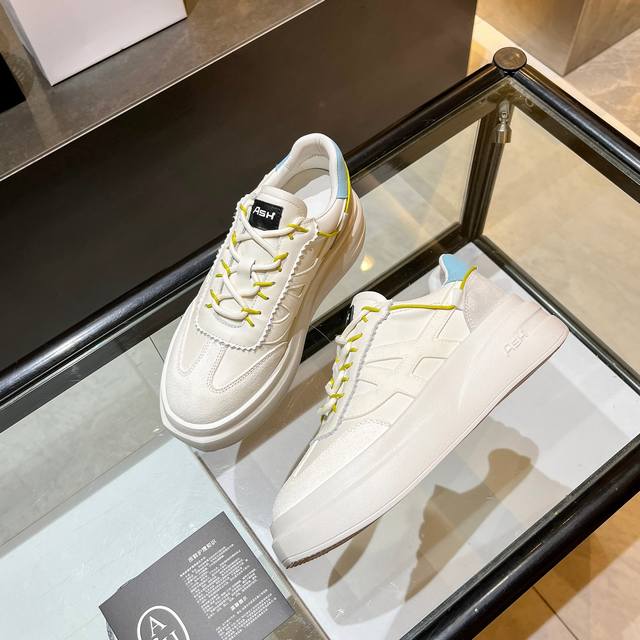 / 上新Ash 款号023 秋季明星同款 休闲系列,简约设计的冲孔透气鞋身,搭配轻盈回弹增高鞋底。 鞋底:橡胶发泡大底面料: 头层牛皮+牛反绒内里:羊皮 颜色:黑色