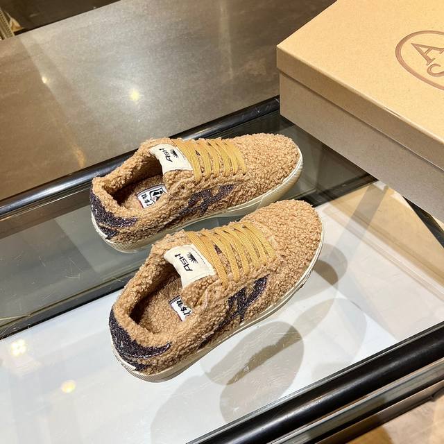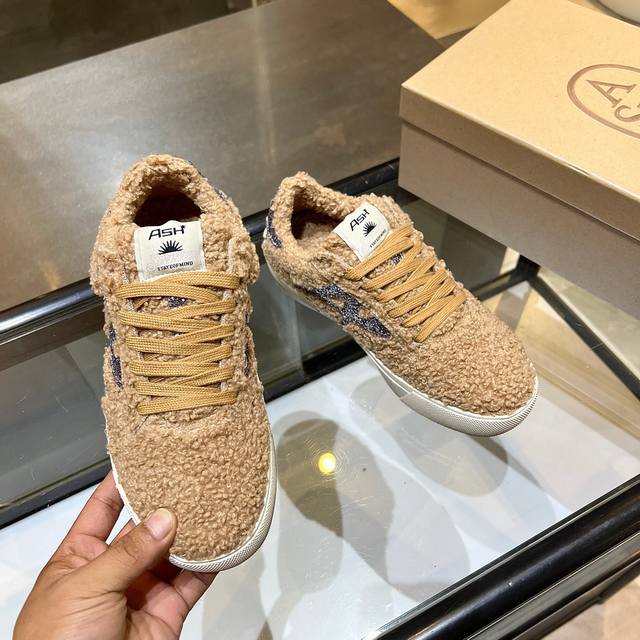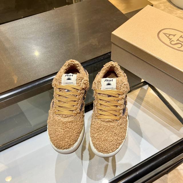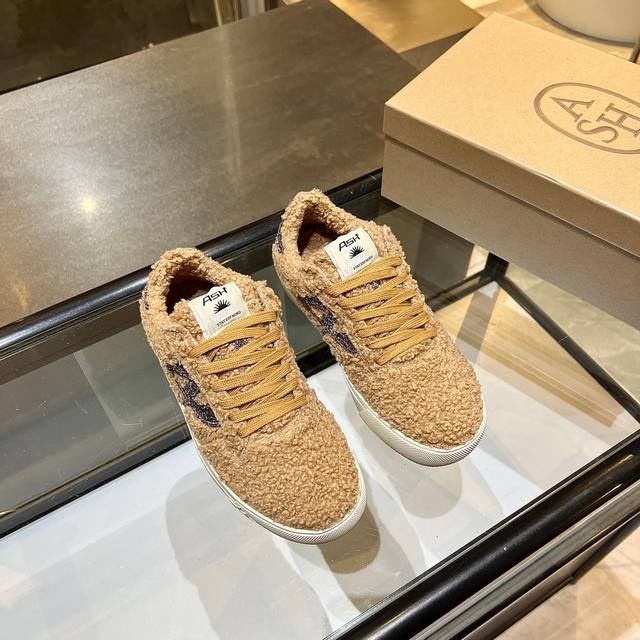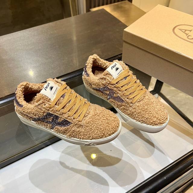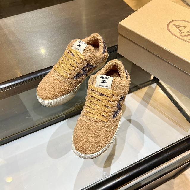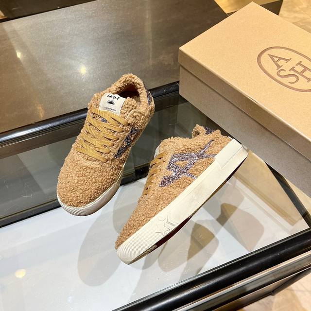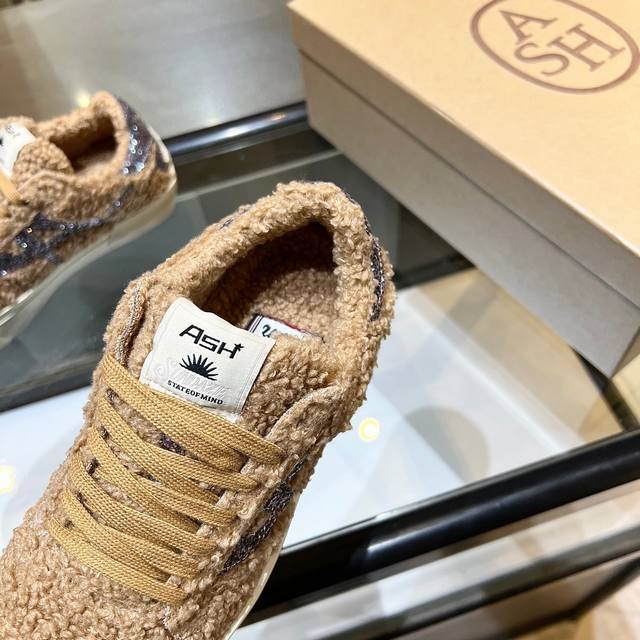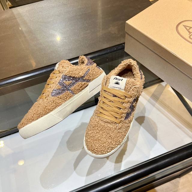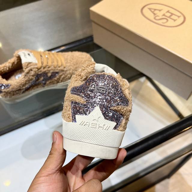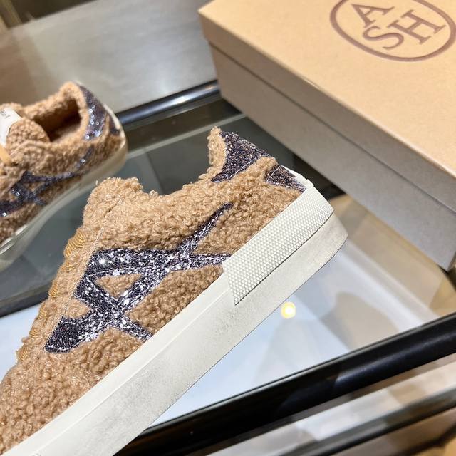 / 上新Ash 款号036 意大利轻奢潮牌复古脏脏小白鞋明星同款休闲系列,搭配轻盈回弹增高鞋底大底做旧复古效果。 面料:仿泰迪绒毛+格利特亮片 鞋底:橡胶大底 内里