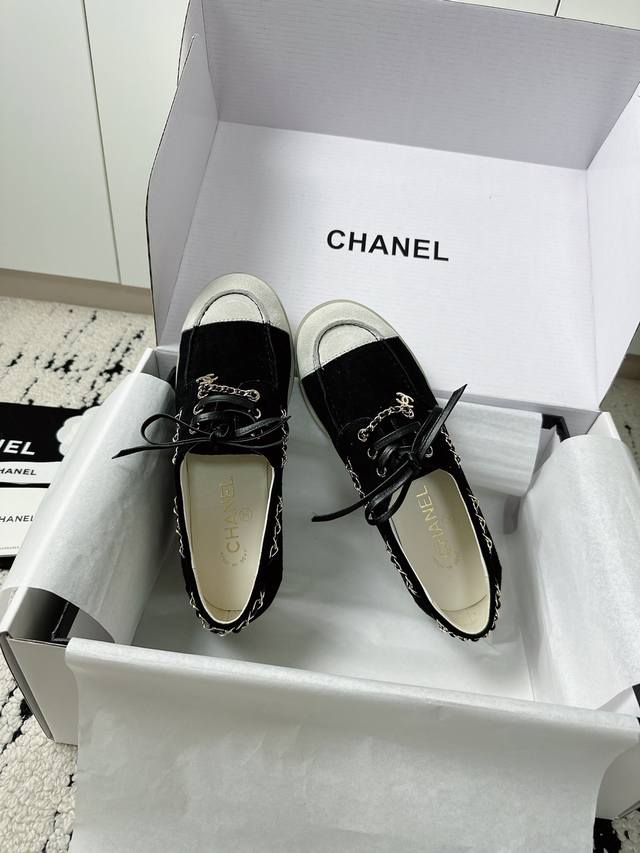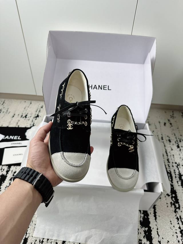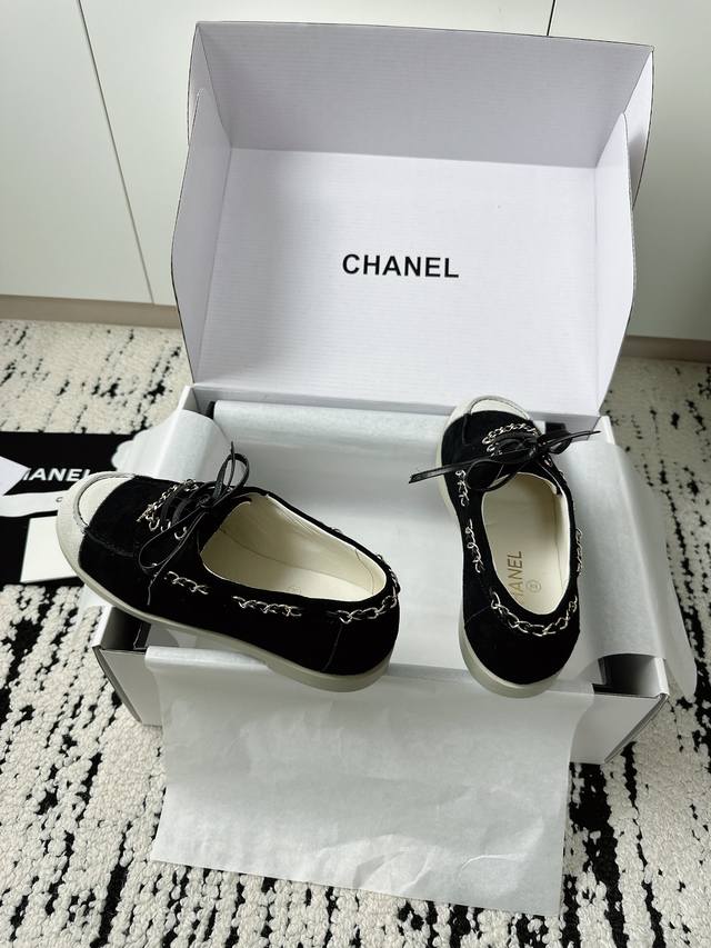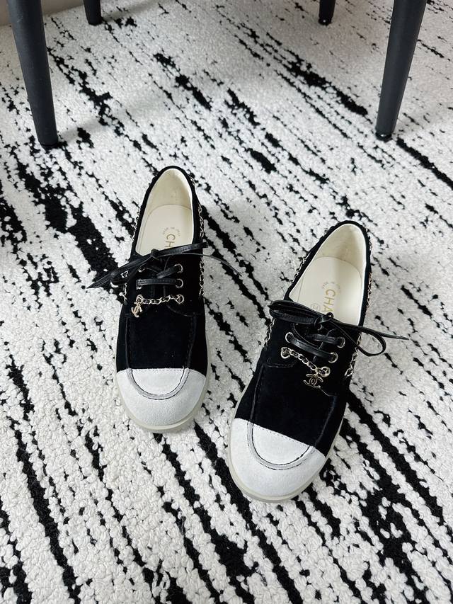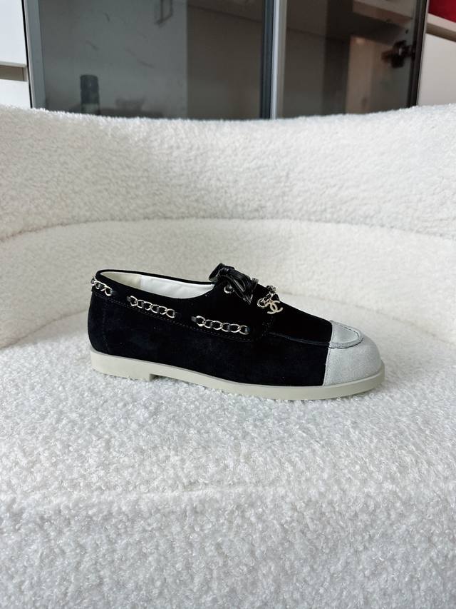 / 专柜最新拼色双C链条,休闲度假系带小皮鞋豆豆鞋乐福鞋。 DDD 鞋侧金属链条随步履轻晃与标志性双C扣形成呼应,平底鞋型兼顾舒适与利落,行走间尽显松弛姿态。 DD