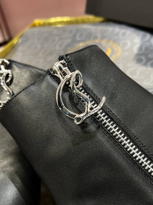 / 代*级* Cl切尔西战利品靴展示了干净的线条和永恒的优雅。它的杏仁形状和侧面有弹性插入物,由黑色小牛皮制成。它设置在70毫米的脚后跟上,有一个带有银色金属Cl字