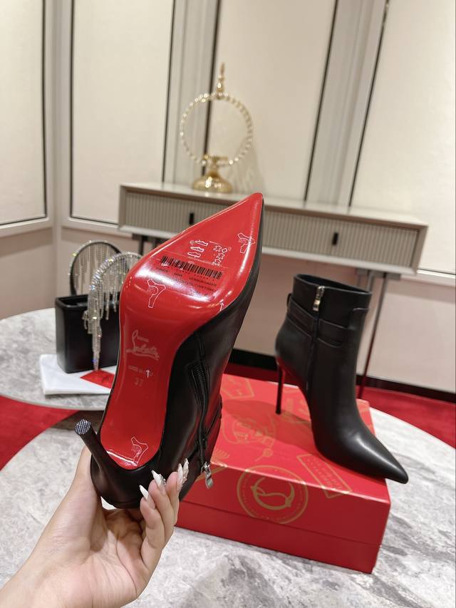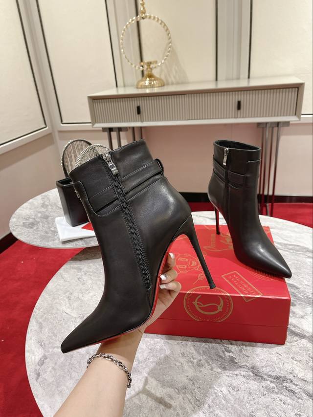 代*级* Lock So Kate Booty 靴子线条简洁,彰显 Maison Christian Louboutin 的精致。这款带有尖头的都市靴子位于 100 毫米细高跟上。它采用黑色皮革制成,并饰有精致的细节。表带饰有标志性的字母表扣,创作者的埃及灵感一目了然。 原版1:1调试楦型,完美修长,线条感十足, 配高档礼盒包装,高端大气,更显尊贵...... 材质 进口小牛皮配电镀原版Logo扣 内里垫脚全羊皮,意大利真皮大底 码数:35-43 40.41.42.43订做,不退不换 颜色:黑色牛皮,黑色