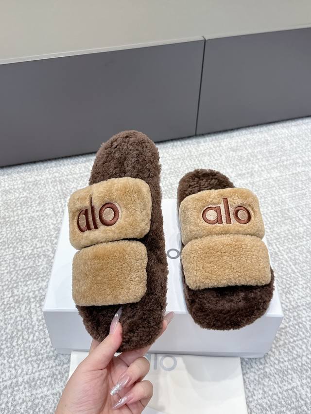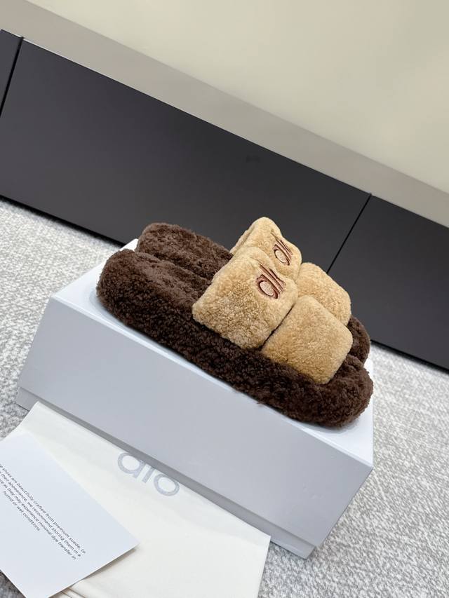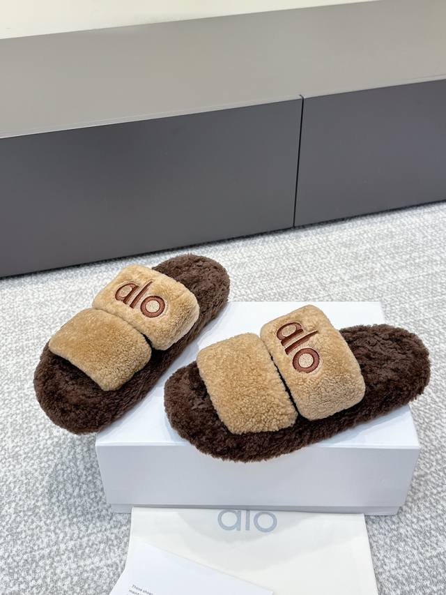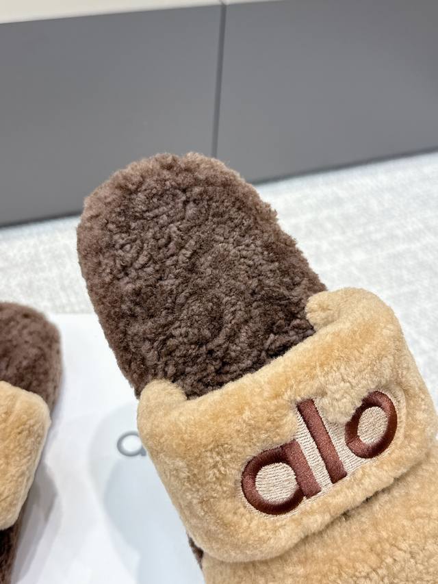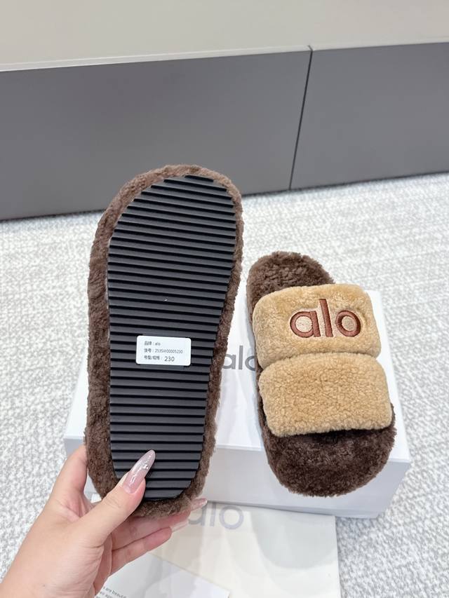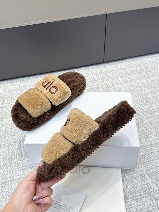 代购级别 Alo|2025S秋冬新款厚底双带露趾羊毛拖鞋 超柔软超温暖的厚底羊羔毛拖鞋来喽,秋冬季抢先预热,厚实细腻的羊羔毛隐藏了小厚底!让上脚增高变得更神秘~