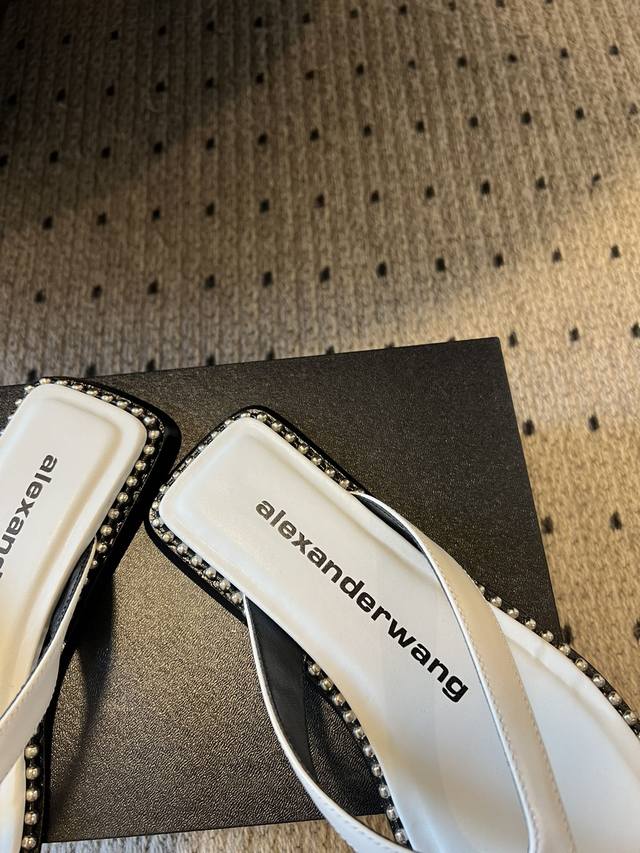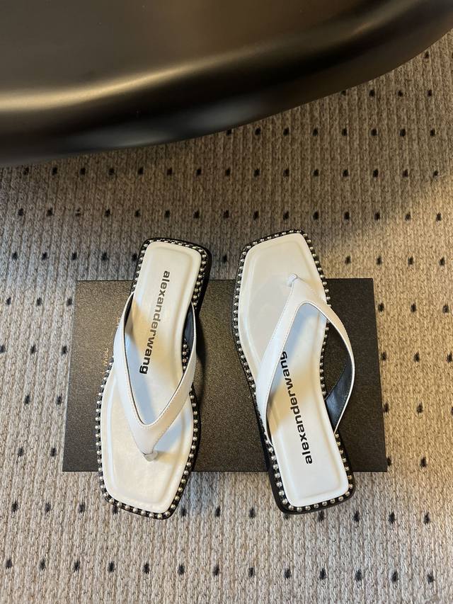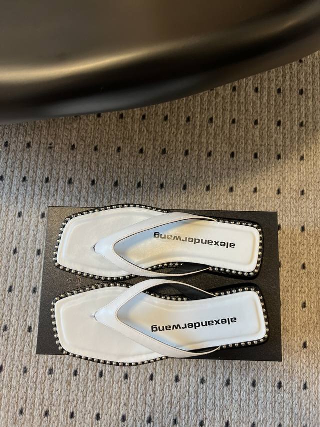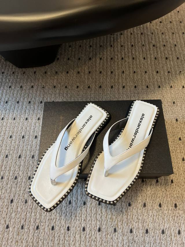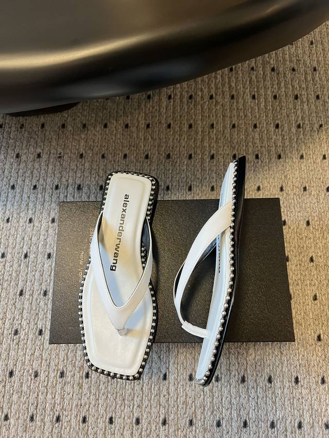 FFF 代购级 DDD Alexande* Wang 大王 25Ss 春夏最新款人字拖 DDD 个性御姐风 超有质感 爱了爱了 该款设计简约上脚时尚舒服 夏季不可缺少的一款大王呈现焕然一新的标志性轮廓。平底款式配上珠珠边缘个性十足 DDD 鞋面:牛皮 原版开模钮钉 内里:羊皮里鞋底:意大利真皮大底 DDD Size:#35-39 40定做 DDD