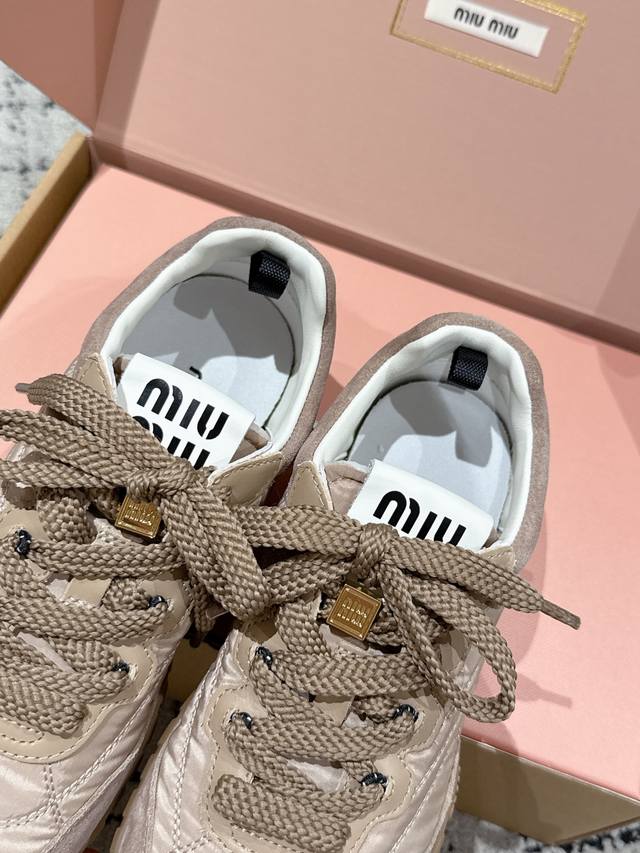 代购级 Miu Miu 缪缪 25 新款英伦风系带 小白鞋 休闲鞋 Miumiu秀场适当独一无二的擦色工艺工艺来自Miu Miu系列的细节特写 新季的潮流要素一