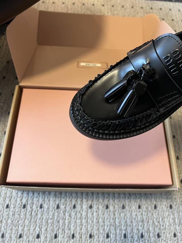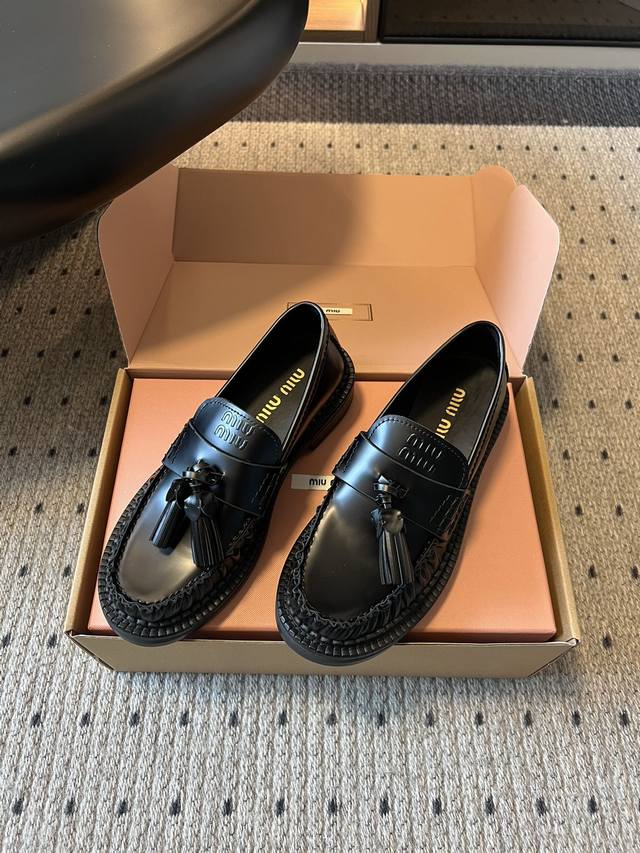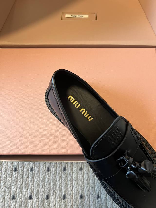 代购级 Miu Miu 25Fw Deck Shoes新款流苏乐福鞋 融合复古与时尚,乐福鞋的经典版型搭配流苏装饰,增添灵动俏皮感;厚底设计又带有些许复古英伦风