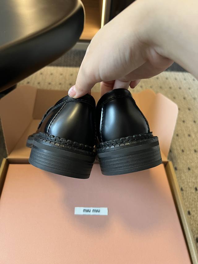 代购级 Miu Miu 25Fw Deck Shoes新款流苏乐福鞋 融合复古与时尚,乐福鞋的经典版型搭配流苏装饰,增添灵动俏皮感;厚底设计又带有些许复古英伦风,同时提升了造型的层次感。采用优质皮革材质,质感细腻且光泽感佳,鞋身的缝线工艺精致,流苏细节处理考究,彰显品牌的精致做工。 搭配百褶裙和白色衬衫,再外搭一件针织开衫,打造清新减龄的校园风格,鞋子的流苏元素与学院风的活泼感相得益彰。 鞋面:牛皮 内里:牛皮 大底:原版开模大底 Size:35-40 40定制不退换