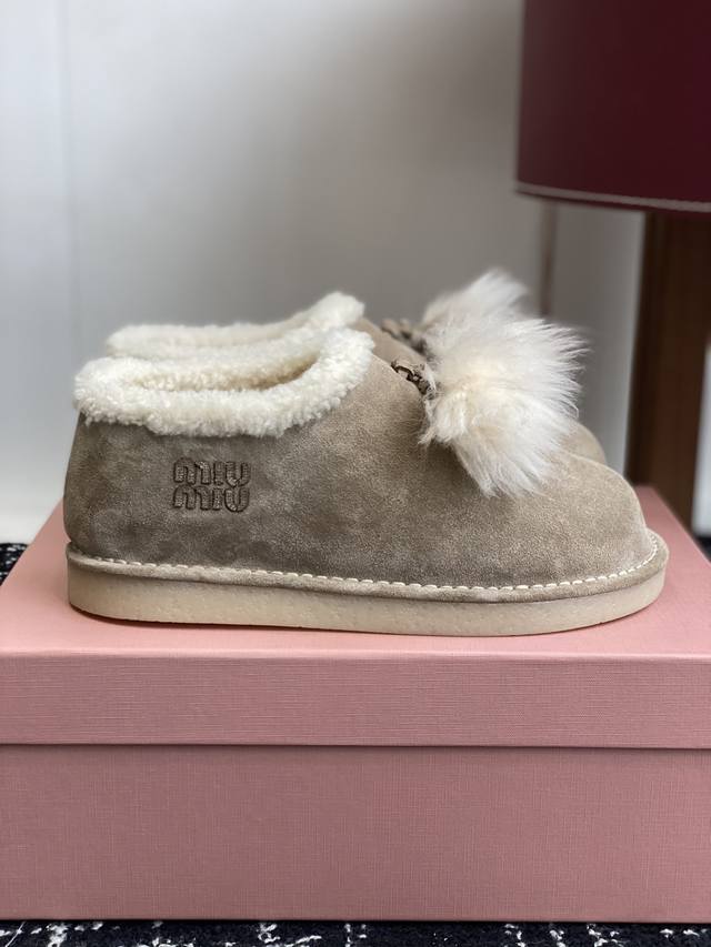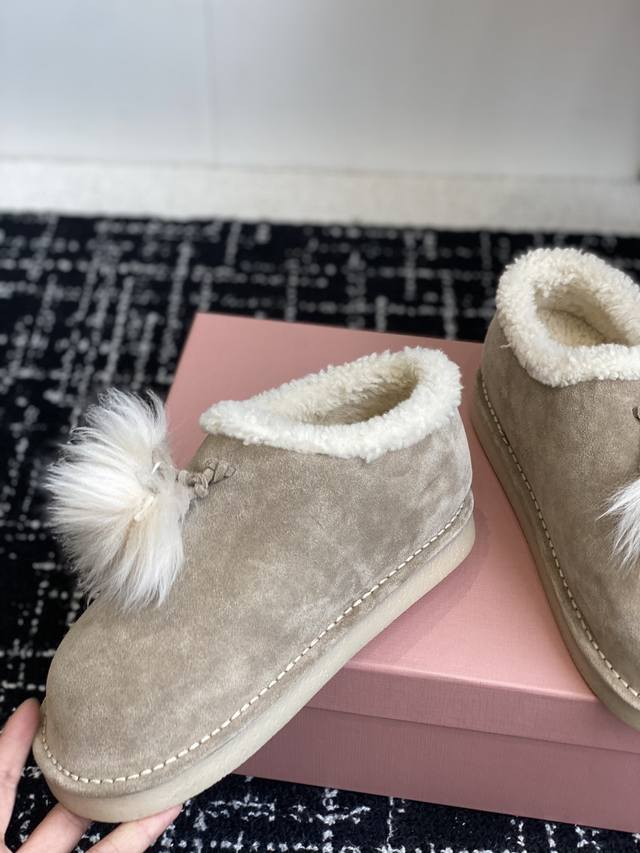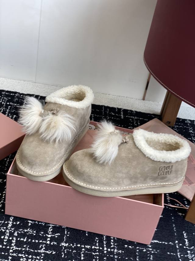 代购级 Miumiu 缪缪 25Ss秋冬走秀款 羊毛小短靴雪地靴毛毛鞋 经常出现在各大时装杂志封面 各路明星、小红书博主都有钟爱 搭配绑带设计更显优雅,上脚尤为