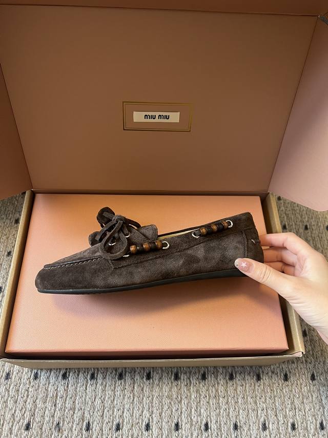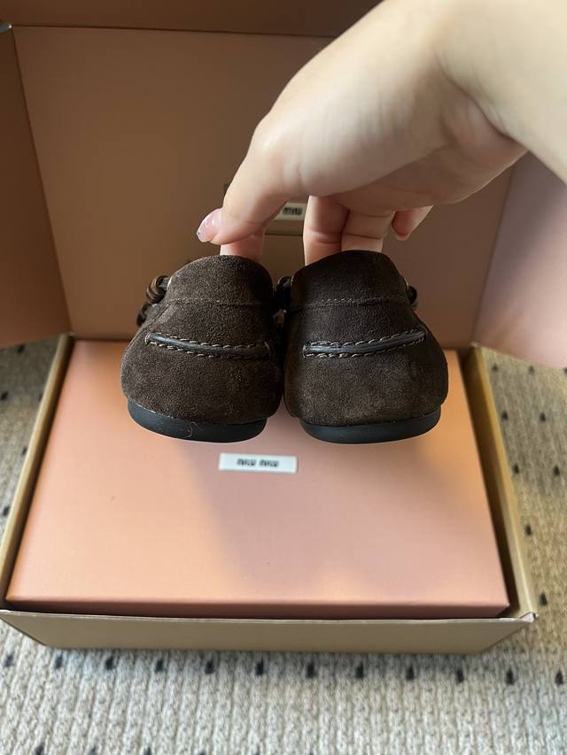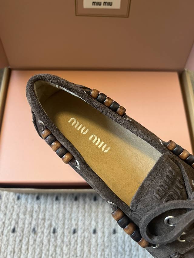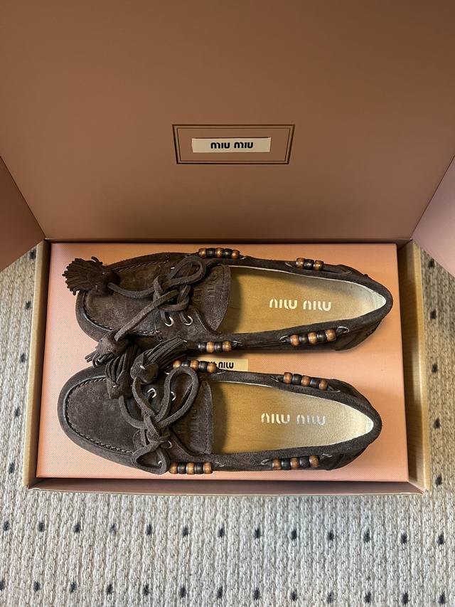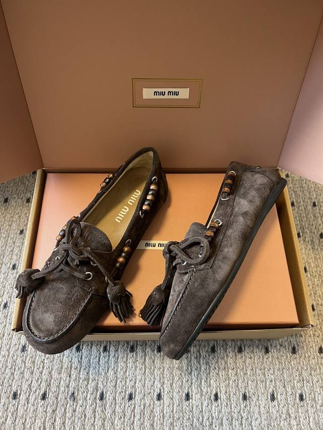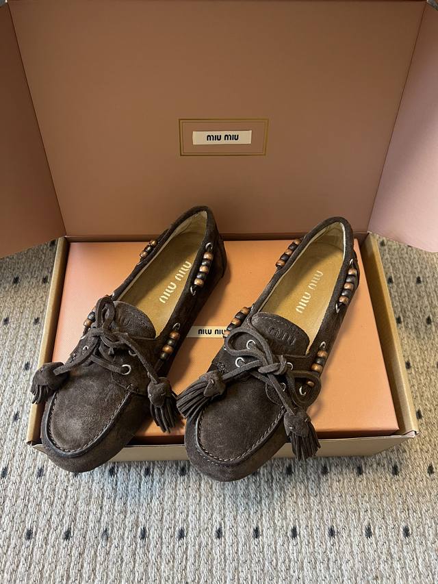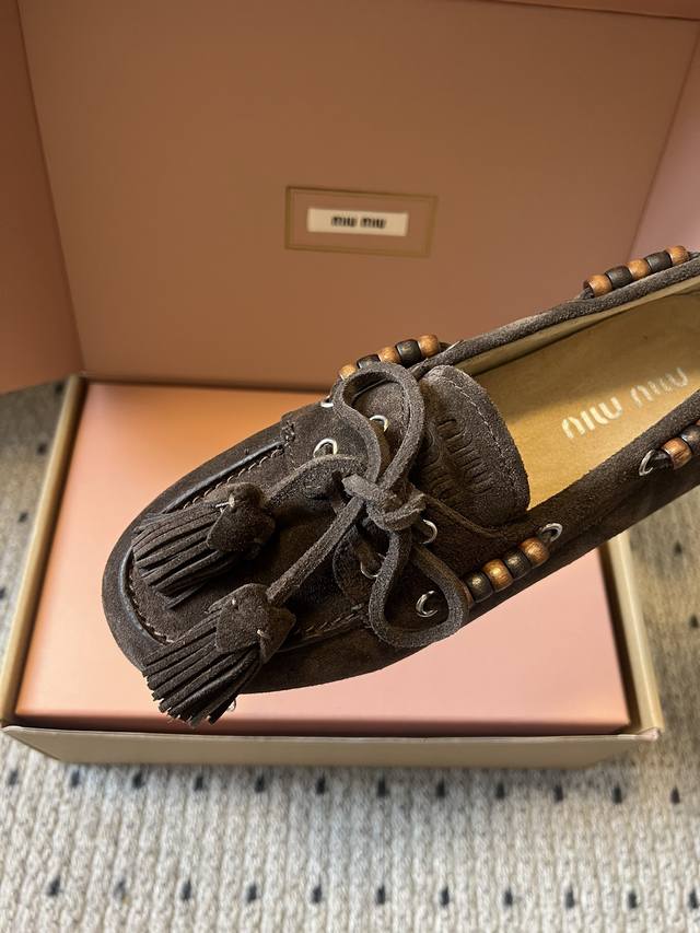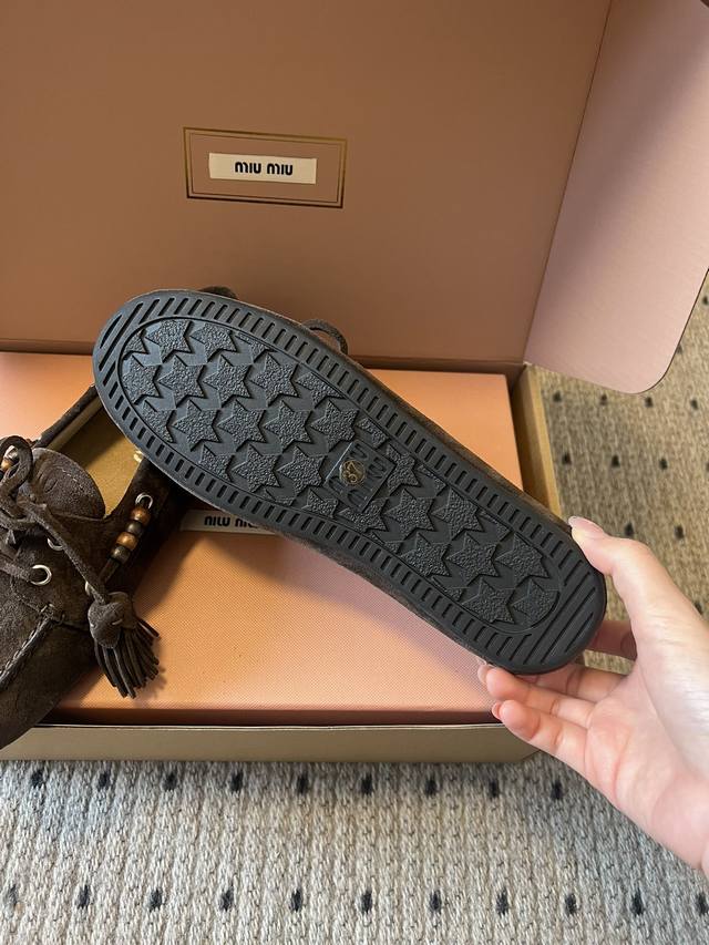 代购级 Miumiu 25Fw Deck Shoes 麂皮双流苏一脚蹬乐福鞋 DDD 鞋面采用反绒皮材质,触感柔软且自带复古质感;鞋侧装饰有串珠元素,通过金属孔眼固定,工艺精致,增添波西米亚风细节。鞋头处设有流苏系带,系带结与流苏的组合强化了复古嬉皮风格; DDD 平底设计保障舒适脚感,鞋型宽松不挤脚,适合日常长时间穿着;反绒皮的柔软度进一步提升穿着舒适度。鞋内底印有清晰的“Miu Miu”品牌Logo,彰显品牌辨识度与质感。 DDD 鞋面:牛反绒 DDD 内里:牛皮 DDD 大底:橡胶大底 DDD 增高