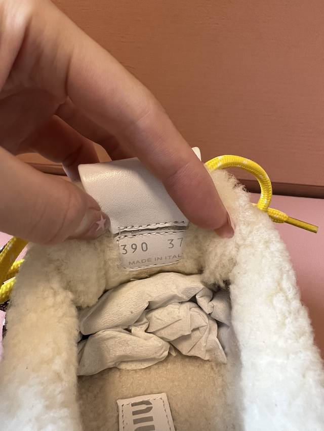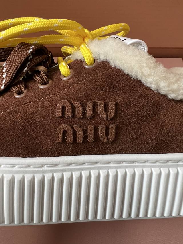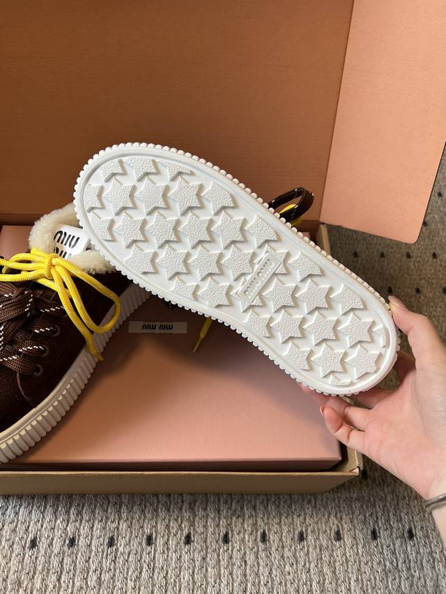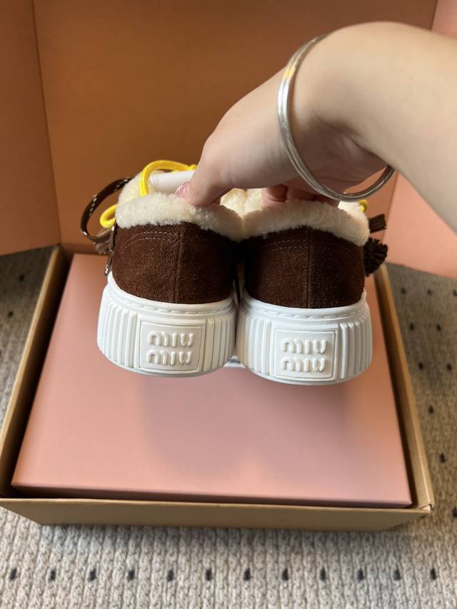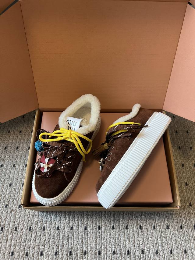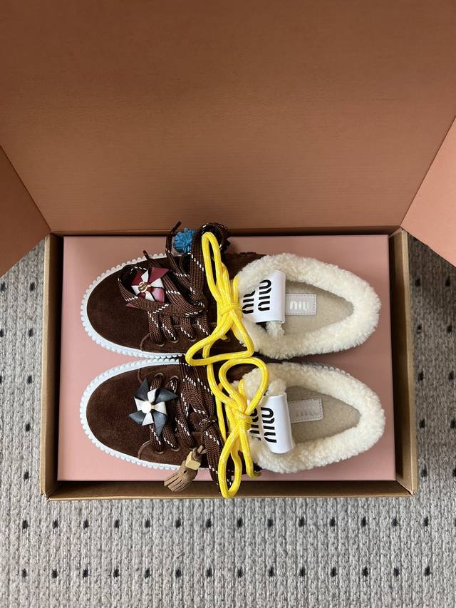 代购级 Miumiu 25Ss 秋冬款厚底双鞋带饼干鞋 DDD 鞋面采用绒面材质,质感细腻;部分鞋款鞋口处有毛绒设计,增加保暖性与可爱风格。色彩丰富且对比鲜明,有棕色、米色等基础色调,搭配黄色、红色等亮眼鞋带,还有彩色风车、毛球等装饰元素,极具视觉冲击力。 DDD 配备了多样的鞋带样式,同时鞋面上有风车造型的装饰,增添了童趣与设计感,让鞋子更具个性。厚底的饼干鞋型,兼具时尚感与一定的增高效果,整体风格甜酷又不失可爱,融合了复古与潮流元素。 DDD 鞋面:牛反绒 DDD 内里:牛裡 羊羔毛 DDD 大底:T