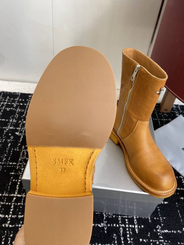 代购级 Smfk十字架新款 含金量谁懂 短靴秋天里的一抹黄,其实它很帅升级版的 这双短靴是很有质感的油蜡黄色 配合马皮面料制作而成 大底使用固特异工艺进行固定缝
