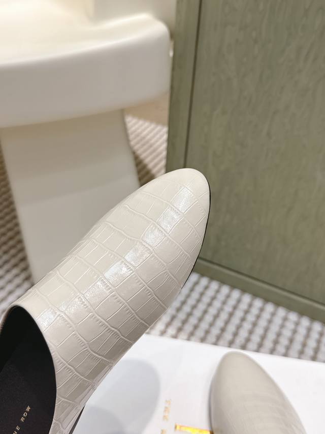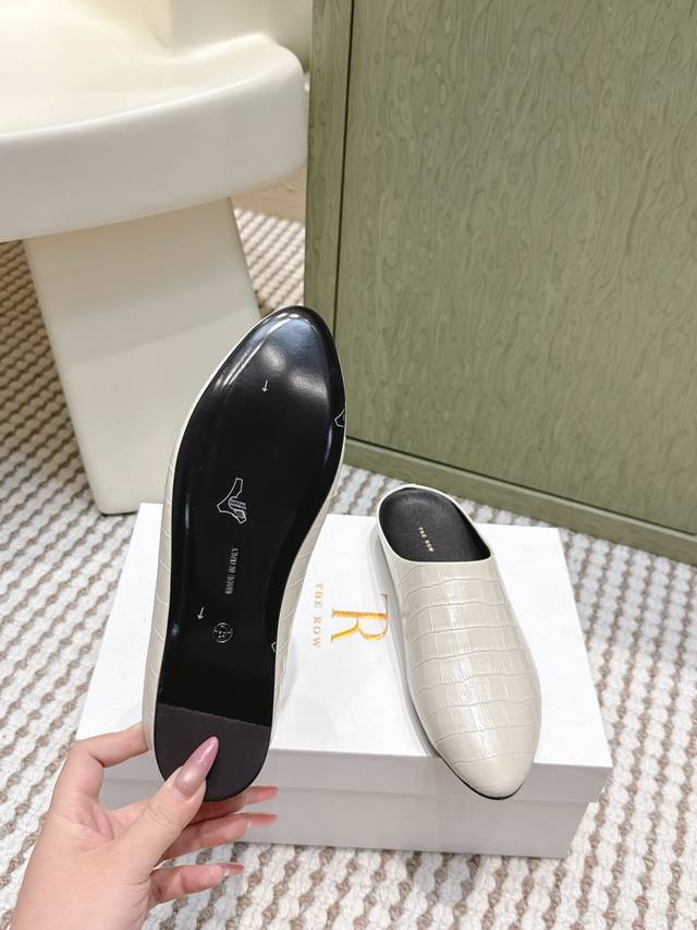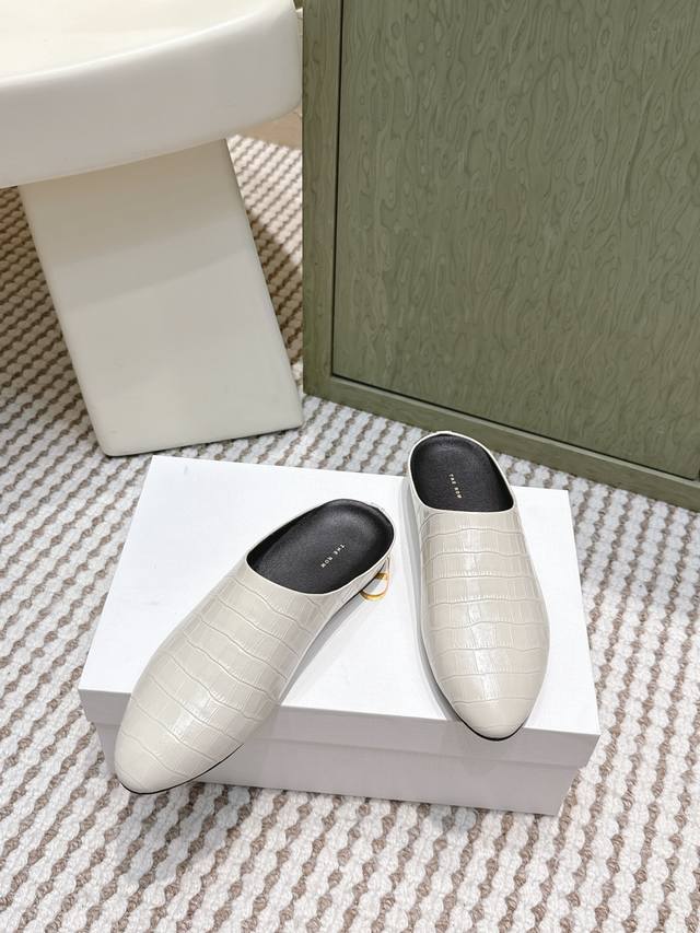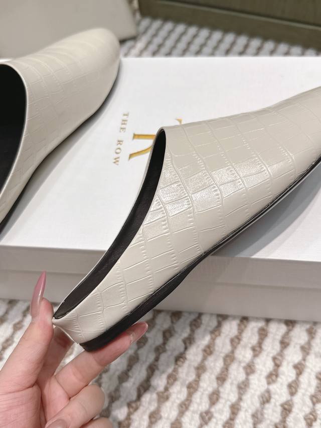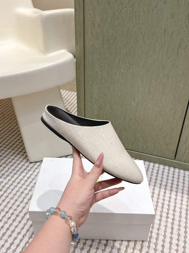 代购级 DDD The Row25Ss牛皮压纹平底穆勒拖鞋 DDD 压花皮革,纹理清晰且光泽细腻,既呈现奢华质感,又通过压纹设计增添视觉层次与复古韵味。 DDD 延续品牌标志性的极简美学,以尖头穆勒鞋结构呈现,线条流畅利落,能修饰脚型、显腿长,适配通勤、休闲等多元穿搭场景。 DDD 鞋内采用柔软衬里,搭配贴合脚型的弧度设计,无后跟的穆勒结构让穿脱更便捷,长时间穿着也不易产生压迫感。精准传递The Row“低调奢华”的设计理念,极简轮廓与高级材质的结合,使其成为兼具实用性与辨识度的代表性鞋款。 DDD Si
