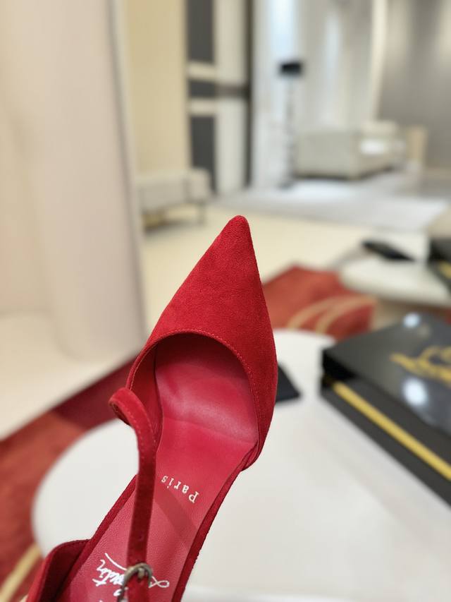 / 侧带单鞋W. Maison Christian Louboutin 这款鞋采用 100 毫米细高跟鞋跟,露出标志性的 Loubi红色鞋底,由 Fever 红色羊