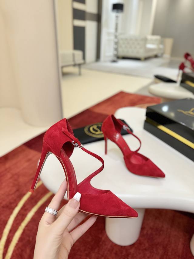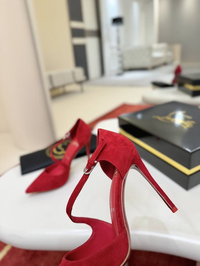 / 侧带单鞋W. Maison Christian Louboutin 这款鞋采用 100 毫米细高跟鞋跟,露出标志性的 Loubi红色鞋底,由 Fever 红色羊