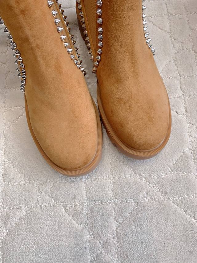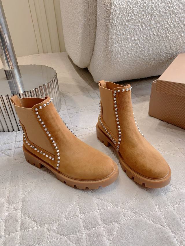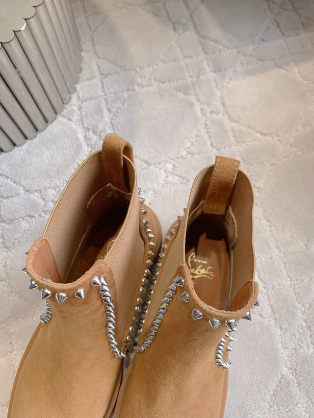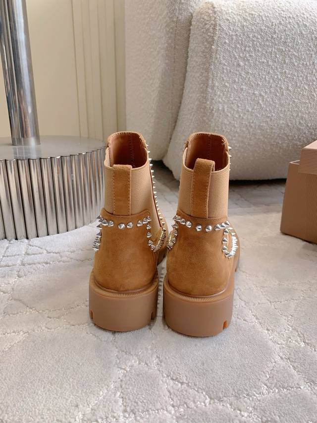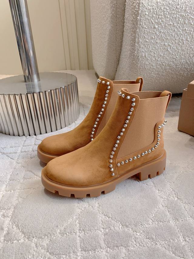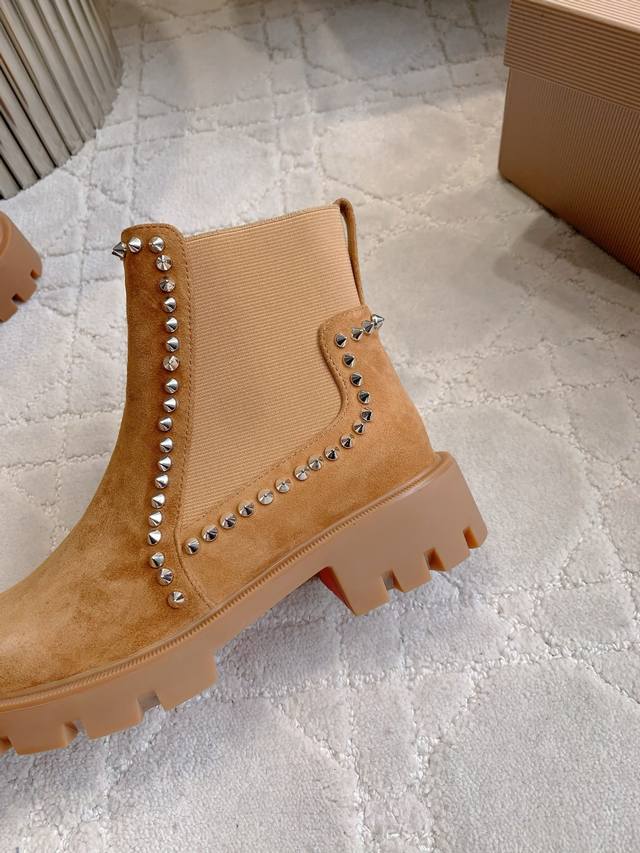 光面 铆钉 Christian Loubouti*新款切尔西厚底短靴 上脚超级显瘦 秋冬百搭神器 好穿不累脚 鞋面牛皮 羊京 内里垫脚羊皮 原版开模大底 底厚4Cm 尺码35-39 34 40 41 42 43定做