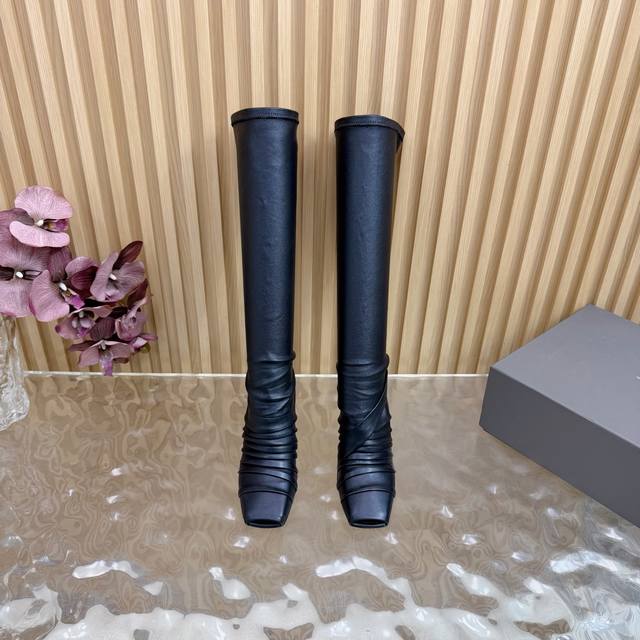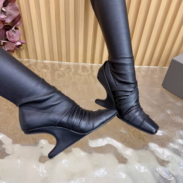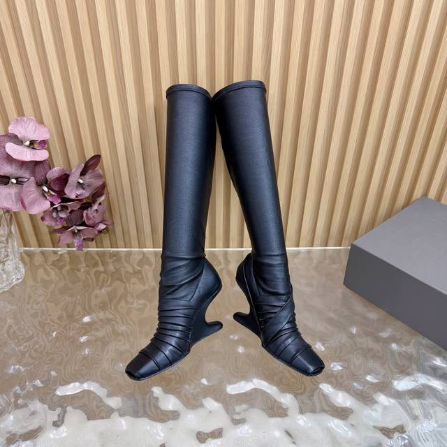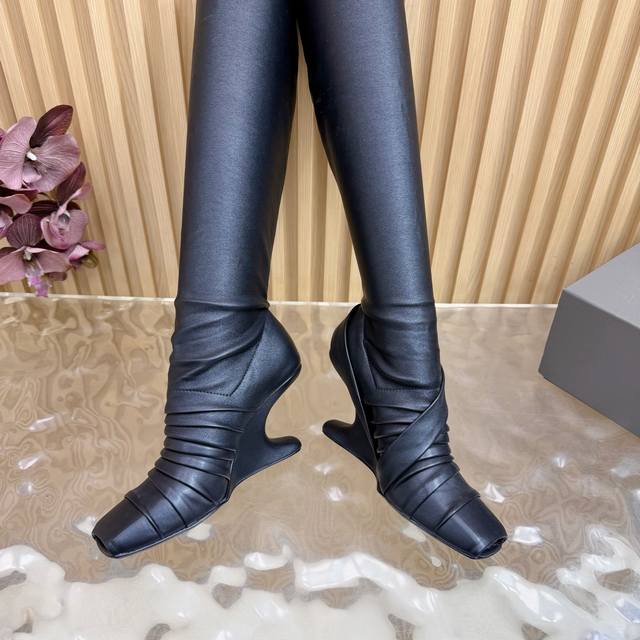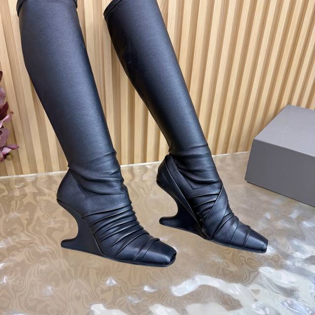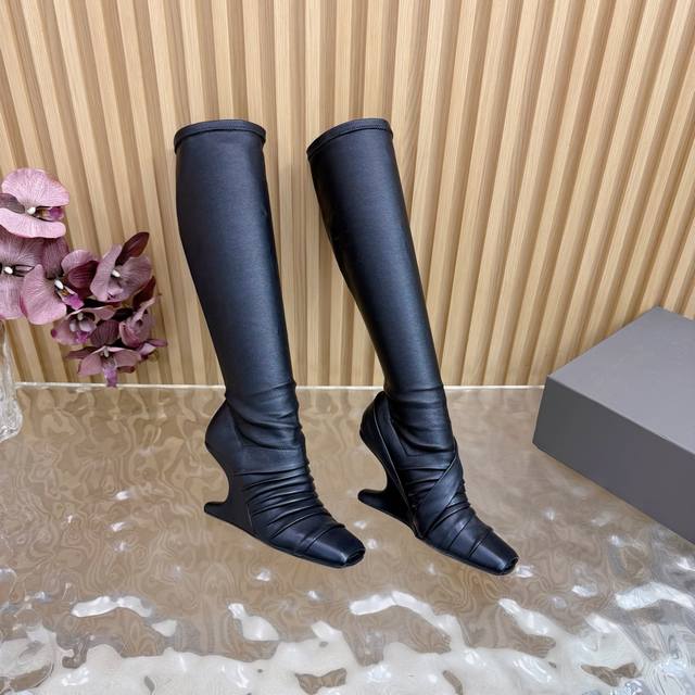 / 光面 马毛 2025秋冬新品Rick Owens欧文斯高跟弹力坡跟高筒靴,时装走秀同步发售 牛羊皮拼接棕色羊皮,鱼嘴方头设计 带毛毛拼接 细节独特 全新带盒 3