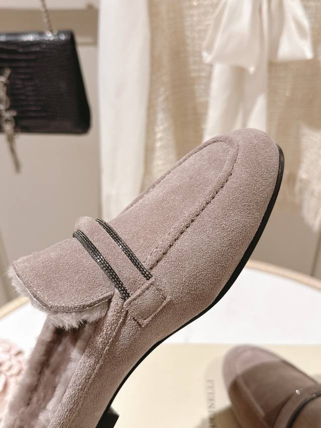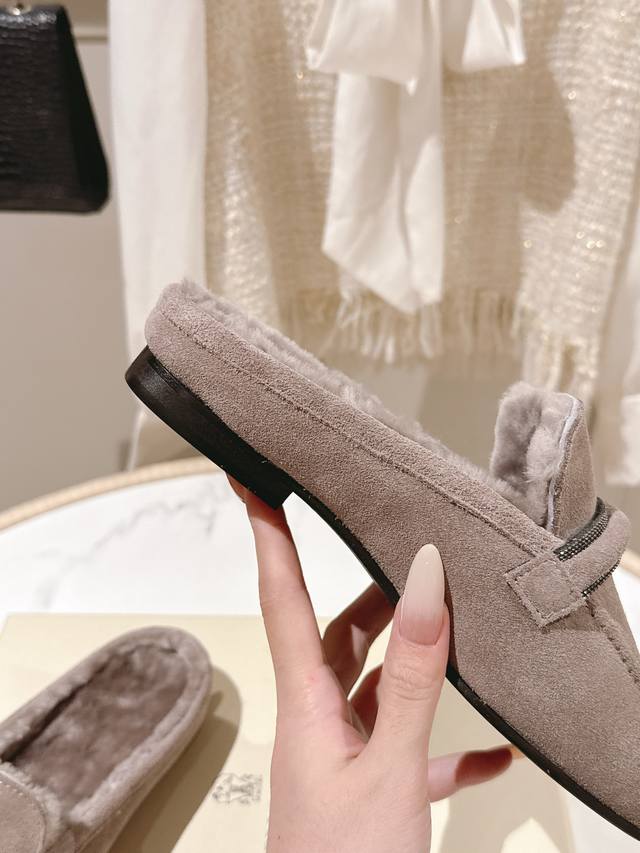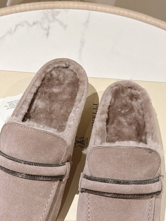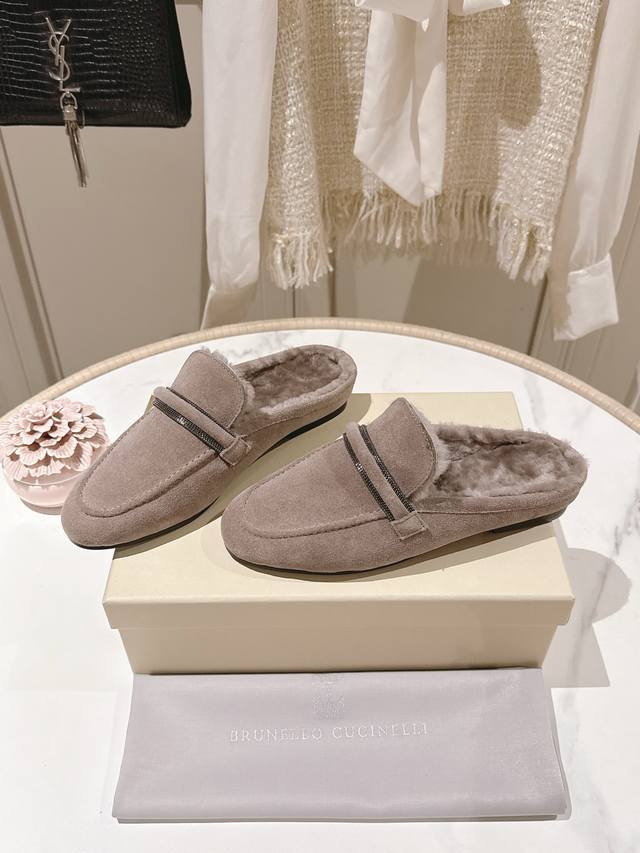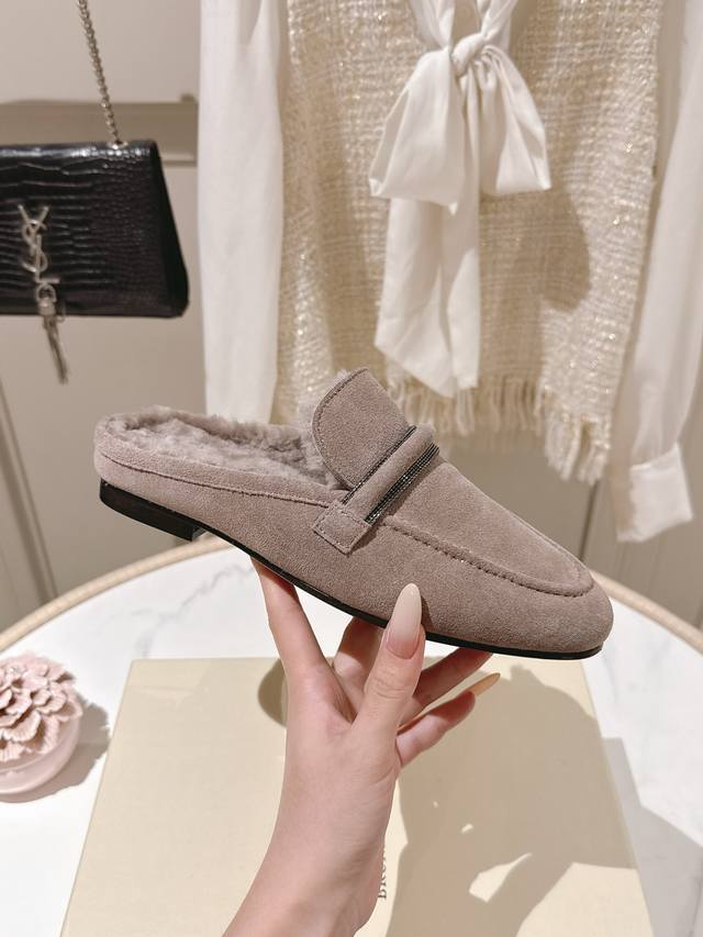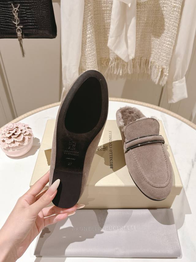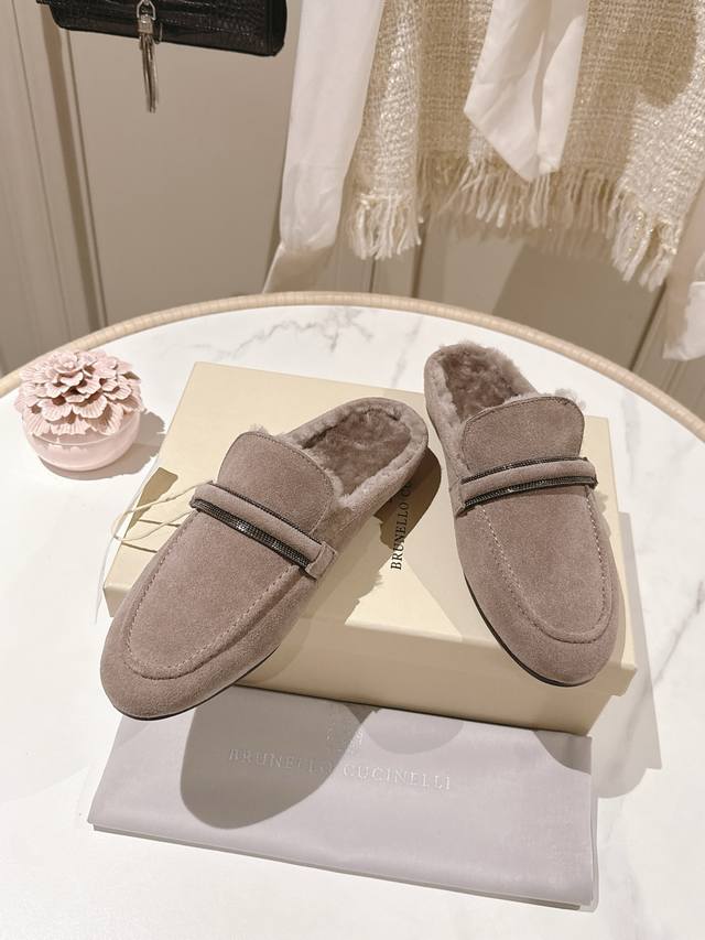出厂价p 独家款 市场最高品质 Brunello Cucinelli Bc平底羊毛半拖材质:进口牛京/羊皮 纯手工串联珠链配饰。 内里:羊毛,专柜原版注塑真皮大底 码数:35-42 40、41、42定制不退换 DDD