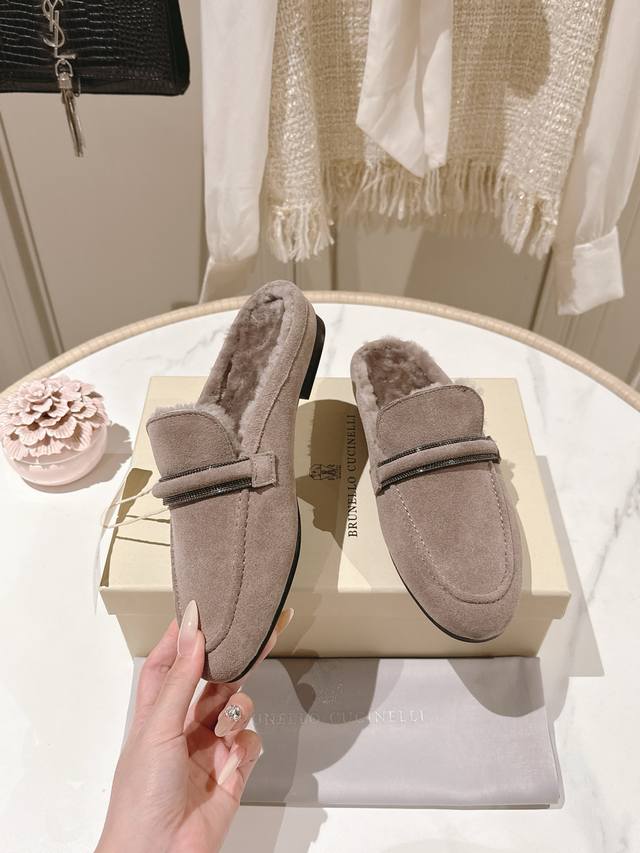 / 出厂价p 独家款 市场最高品质 Brunello Cucinelli Bc平底羊毛半拖材质:进口牛京/羊皮 纯手工串联珠链配饰。 内里:羊毛,专柜原版注塑真皮大