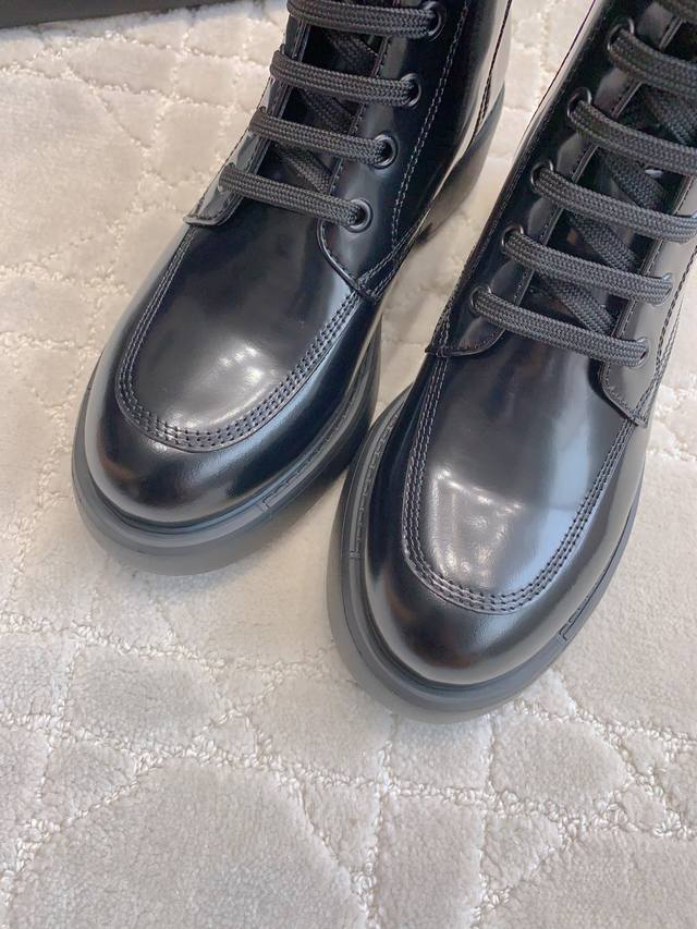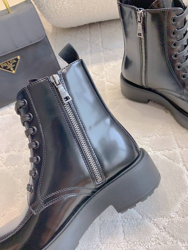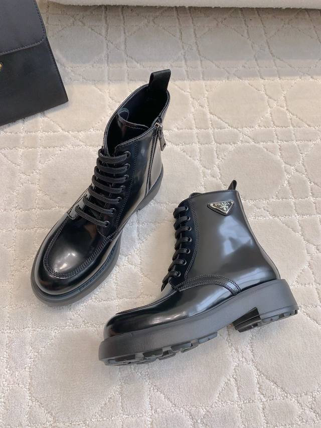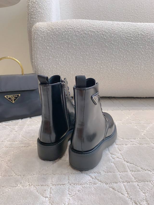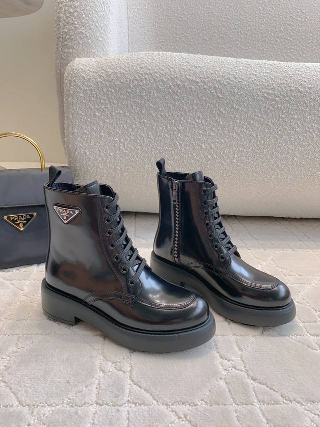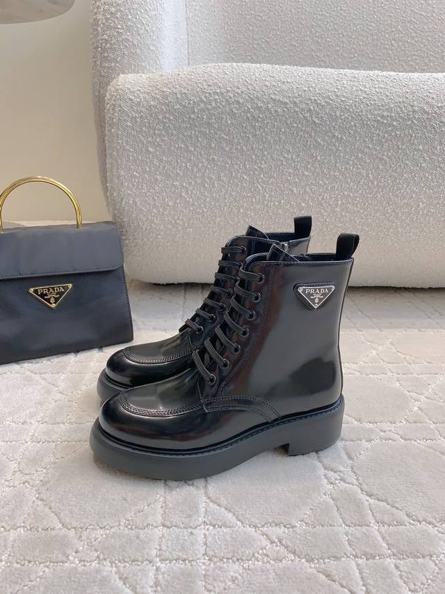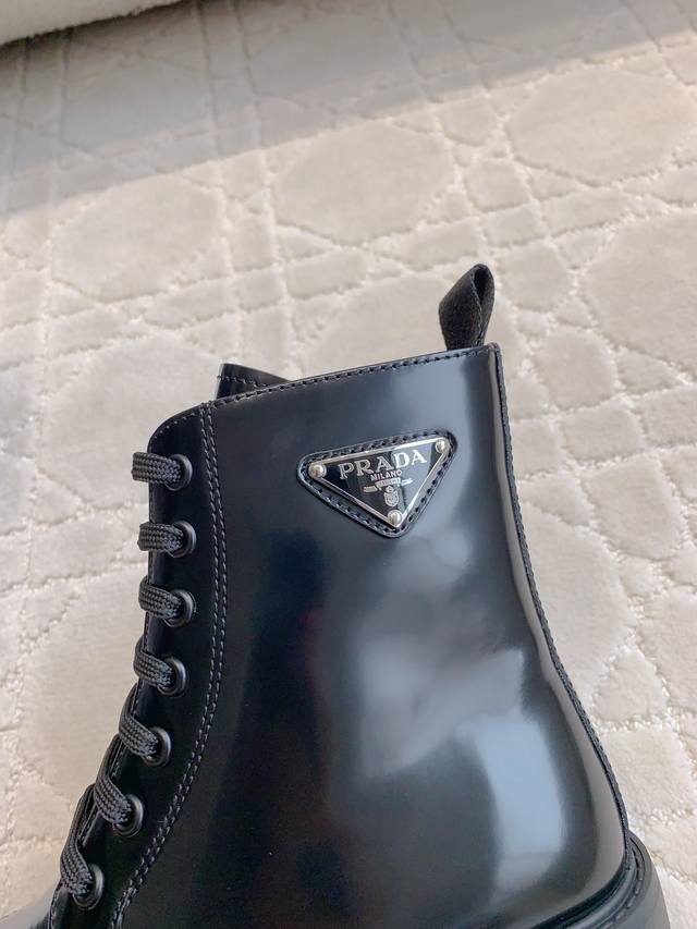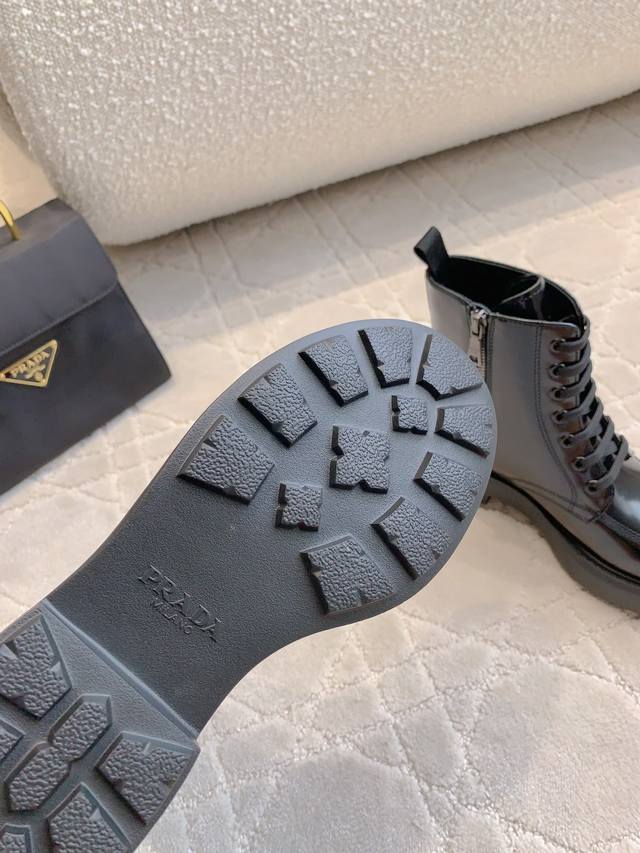出厂价p 顶级版本 prad*新款三角标厚底马丁短靴 挺拔有型 上脚有帅又飒 低调又不失精致 鞋底有一定厚度 超显腿长 鞋面原版开边珠牛皮 内里垫脚牛皮 原版开