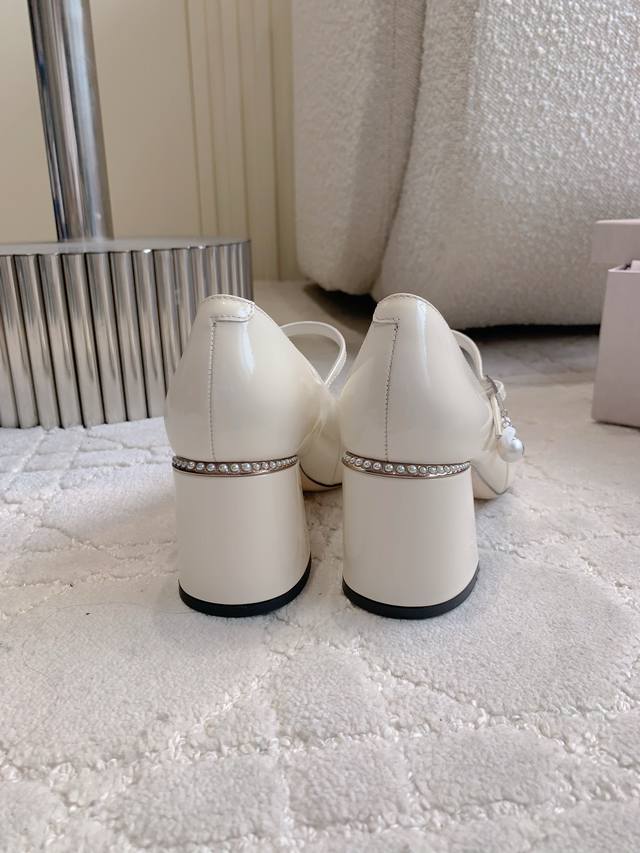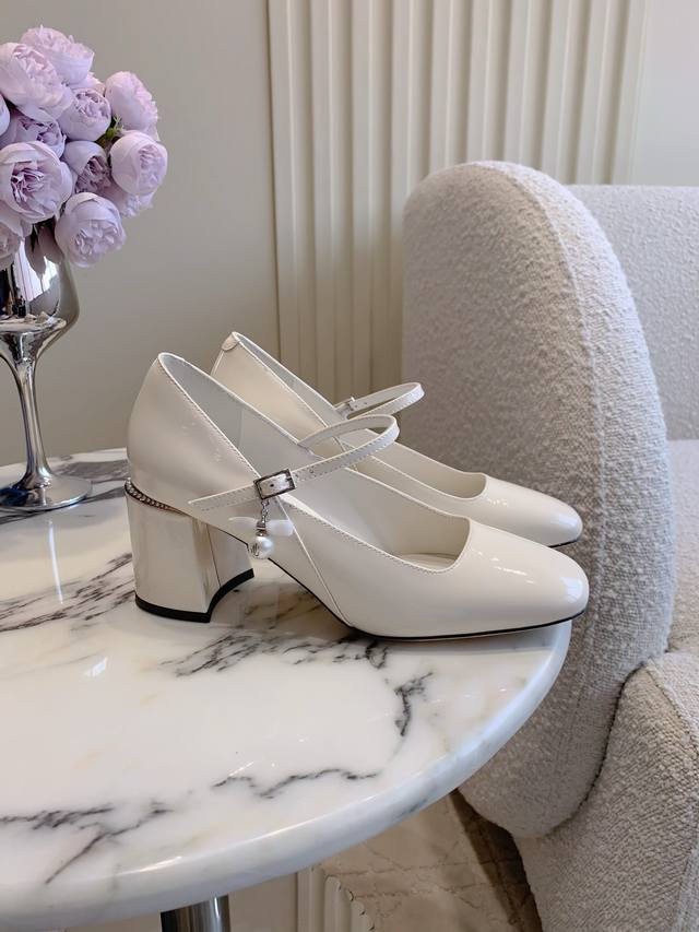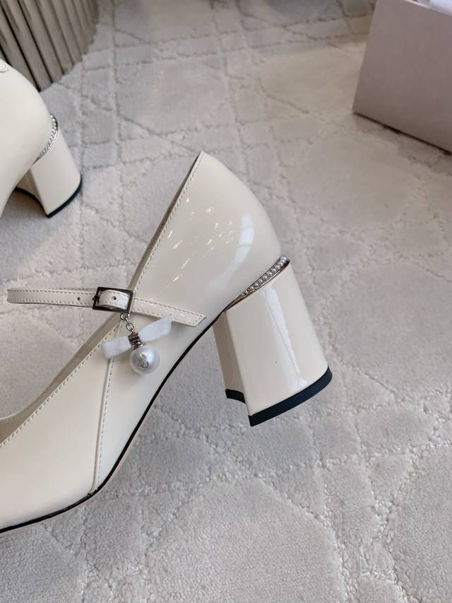 / 出厂价p Jimmy Cho*新款粗跟玛丽珍高跟鞋单鞋 珍珠吊坠精致优雅 经典百搭款 粗跟设计非常好穿 鞋面牛漆皮 内里垫脚羊皮 跟高7Cm 意大利真皮大底 尺