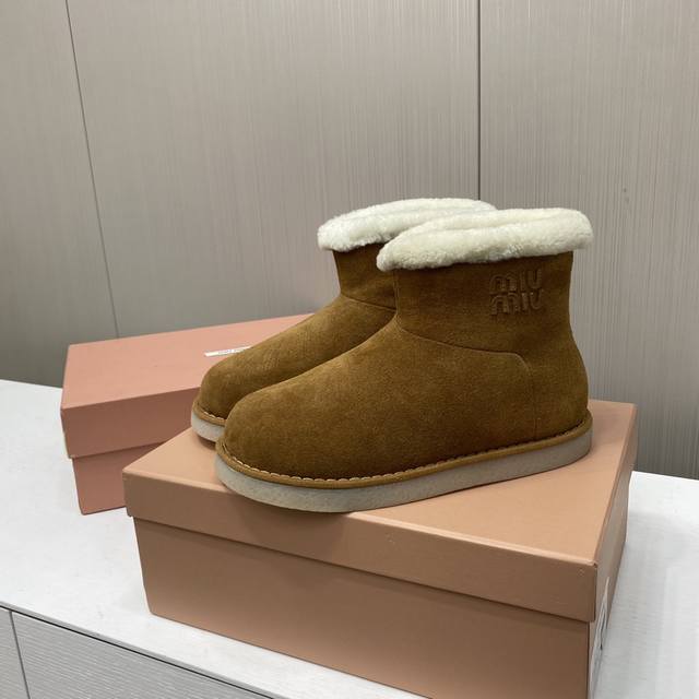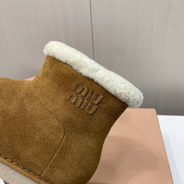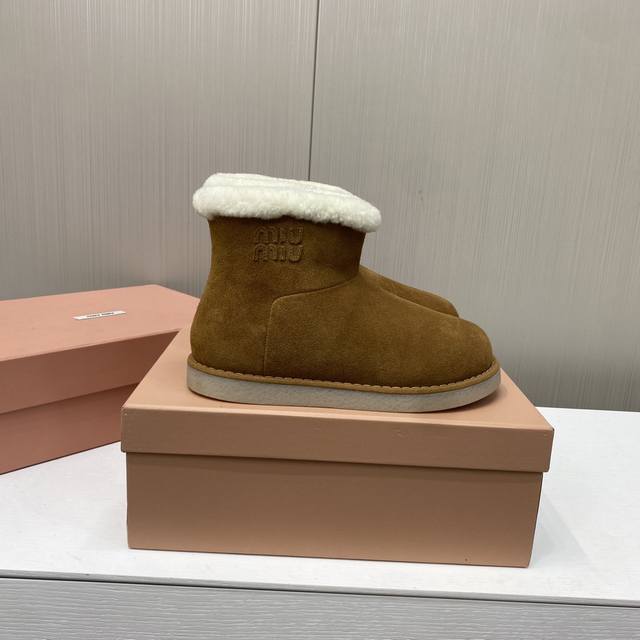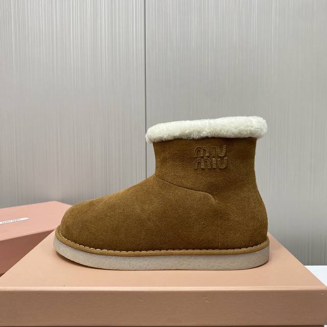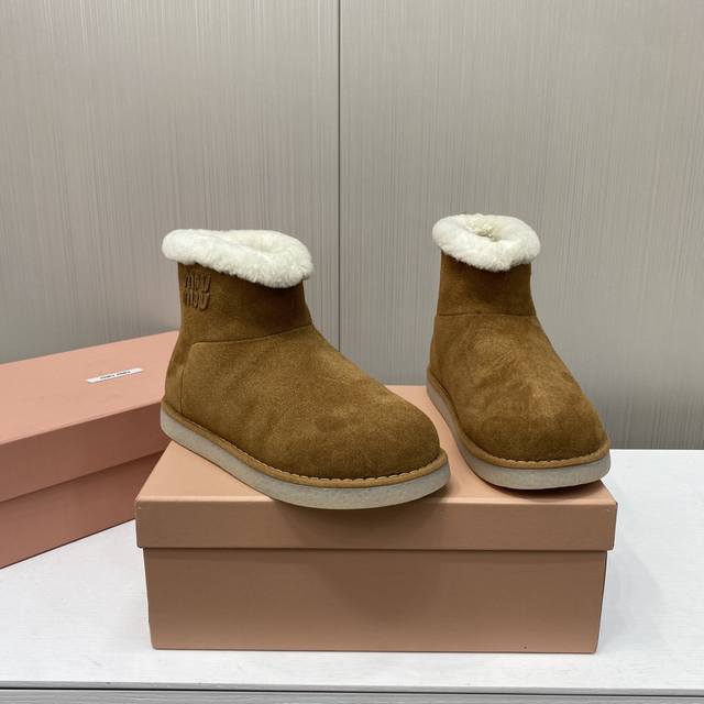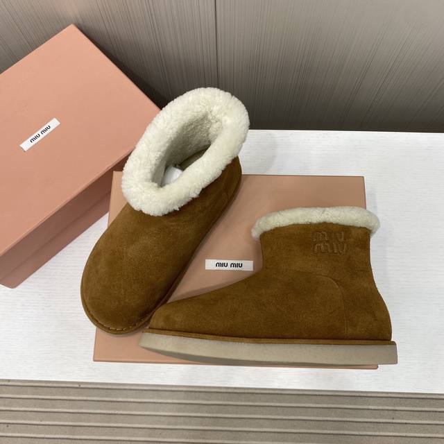 出厂价P Miu Miu缪缪 韩里韩气超火小土豆雪地靴升级版来啦! 其独特的浅口设计,轻松搭配各种服饰,无论是休闲的牛仔裤还是可爱的裙子,都能展示出恰到好处的时尚感。 秉持一贯的优质工艺,鞋面采用高档牛翻毛,细腻柔软,完美贴合脚型,无与伦比的舒适感。内里更是选用奢华羊皮毛一体的小卷毛设计,温暖而亲肤,让寒冷的天气也感受如春般的温暖。 配备防滑橡胶大底,专为湿润天气设计,无论走在哪里都能安稳自信。底面独特的设计,不仅增添了一丝趣味,更彰显品牌的时尚气息。 尺码:35-39 40定做