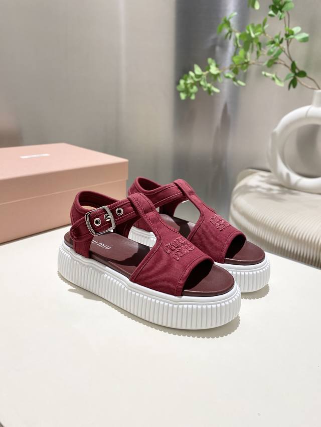 出厂价p Miu Miu 2025春夏新款松糕厚底帆布罗马凉鞋.质感非常高级 厚底设计非常容易驾驭穿搭 各大网红推荐 鞋面采用定制进口高密度帆布 内里垫脚羊皮
