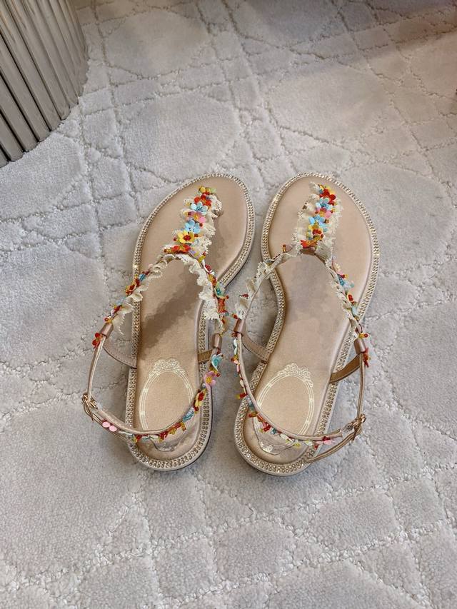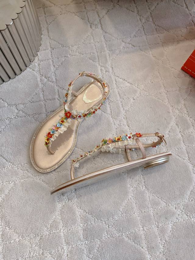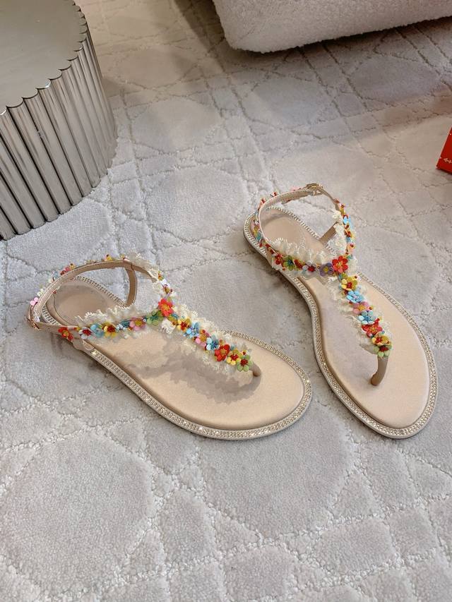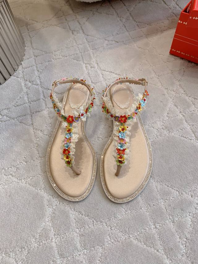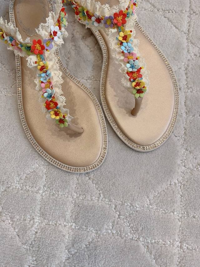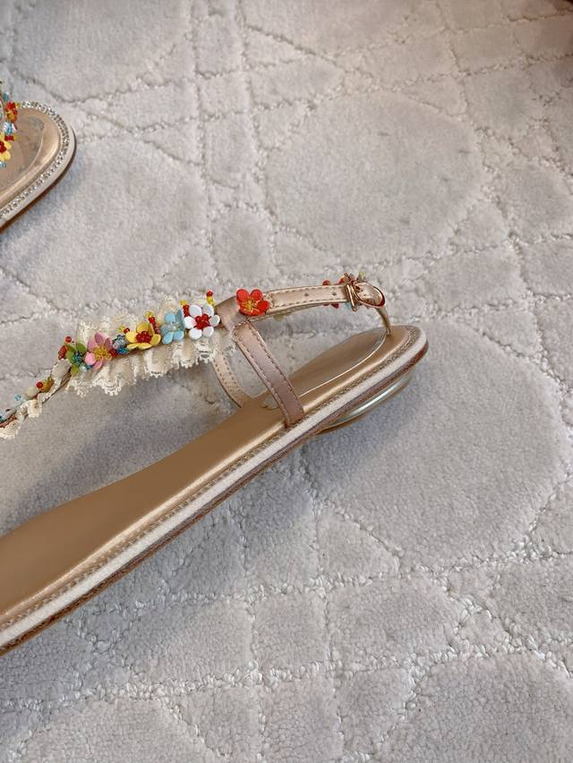 出厂价p DDD Ren* Caovill*重工蕾丝花朵平底夹趾凉鞋 Bling Bling精致逼人 堪称工艺品 DDD 鞋面纯手工缝制花朵 垫脚羊皮 意大利真皮大底 尺码35-39 34 40 41 42 43定做 DDD