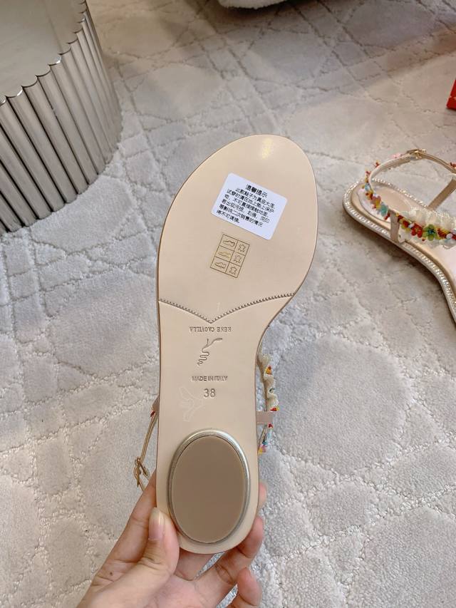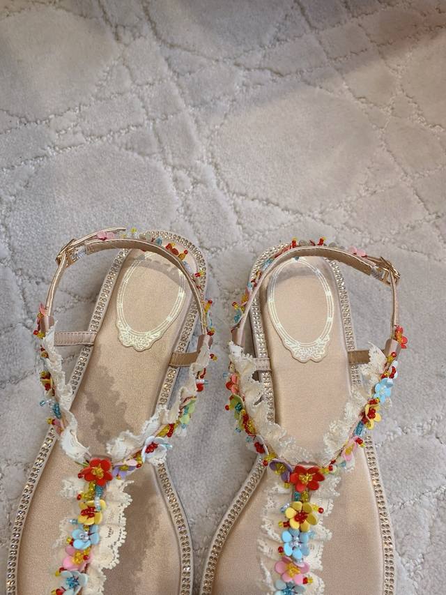 / 出厂价p Ren* Caovill*重工蕾丝花朵平底夹趾凉鞋 Bling Bling精致逼人 堪称工艺品 鞋面纯手工缝制花朵 垫脚羊皮 意大利真皮大底 尺码35