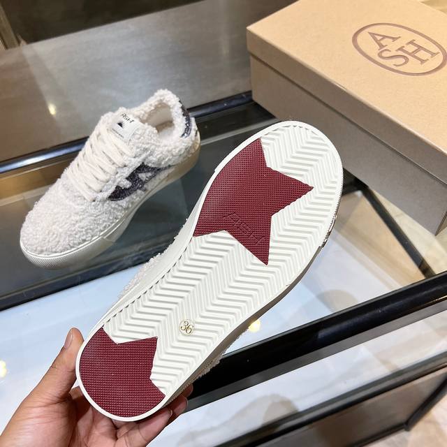 出厂价pp: DDD 上新Ash 意大利轻奢潮牌复古脏脏小白鞋明星同款休闲系列,搭配轻盈回弹增高鞋底大底做旧复古效果。 DDD 面料:仿泰迪绒毛+格利特亮片 DDD 鞋底:橡胶大底 DDD 内里:织物 DDD 码数:35-40 40定制 DDD